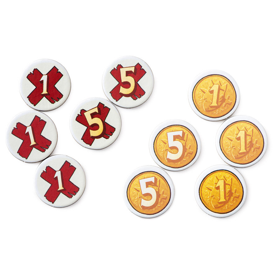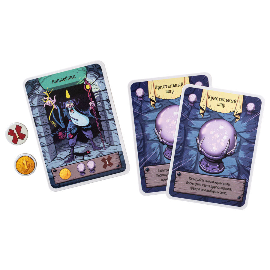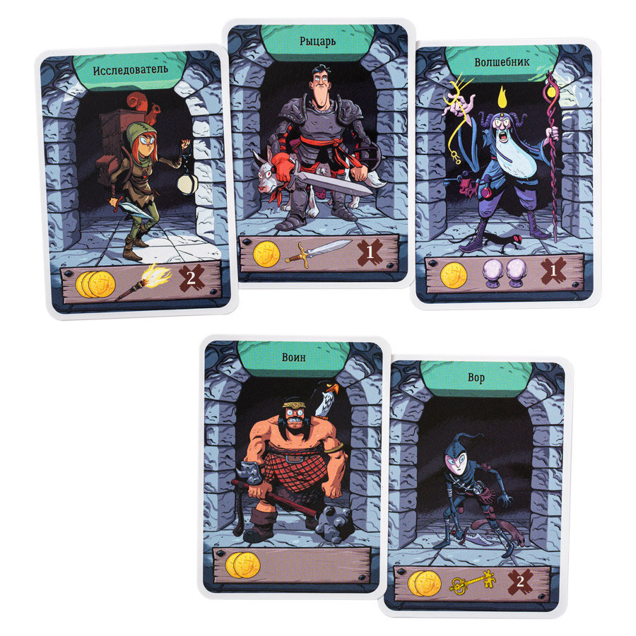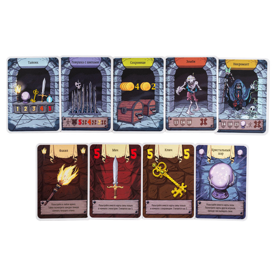 | Комплектация | 7 карт этажей, 30 карт комнат, 25 карт силы, 24 карты предметов, 10 карт боссов, 5 карт персонажей, 38 жетонов монет, 26 жетонов ран, 1 карта свитка, правила игры |
