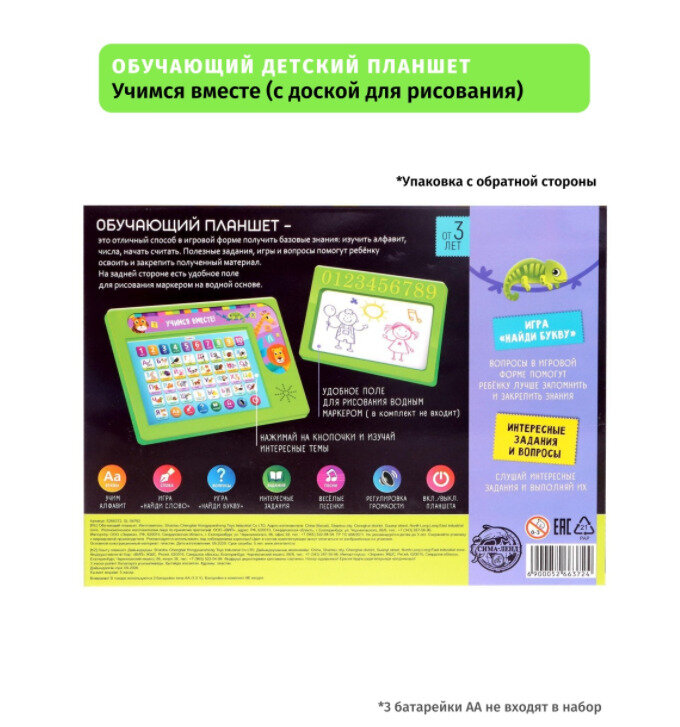 Ниже Вы можете прочитать отзывы на Обучающий детский планшет "Учимся вместе" с доской для рисования/зеленый, ознакомится с подробными характеристиками, посмотреть интересные обзоры и фотографии на Обучающий детский планшет "Учимся вместе" с доской для рисования/зеленый.