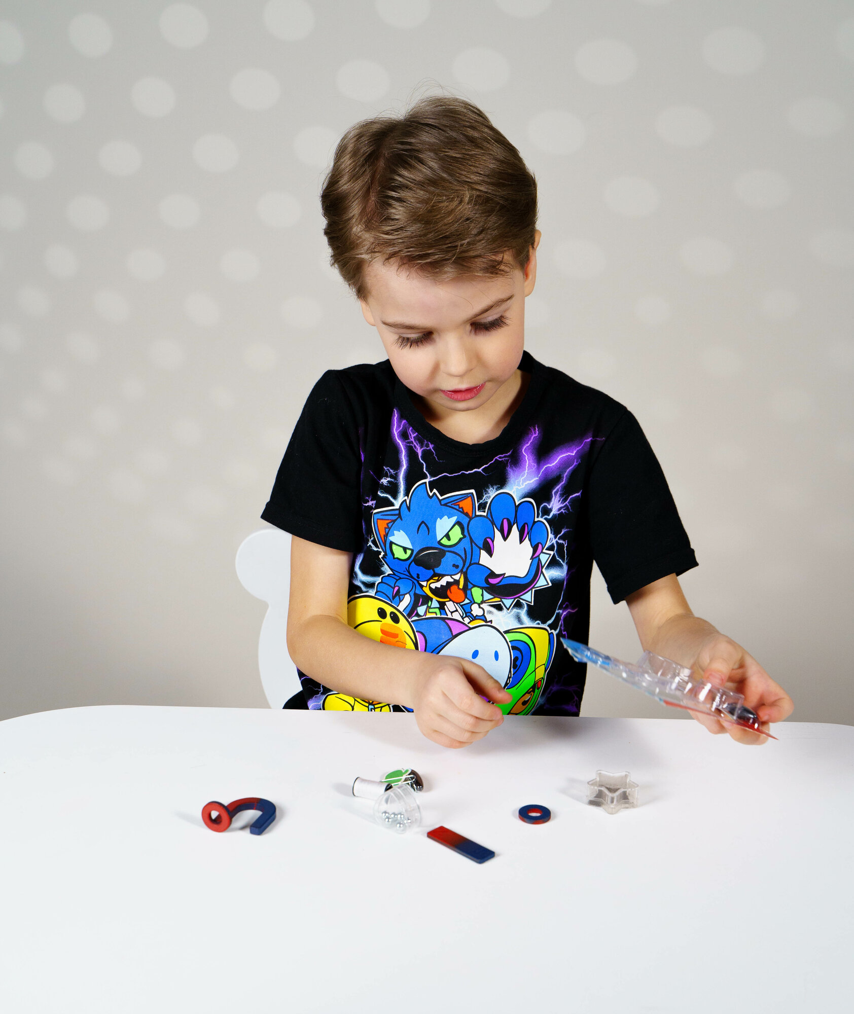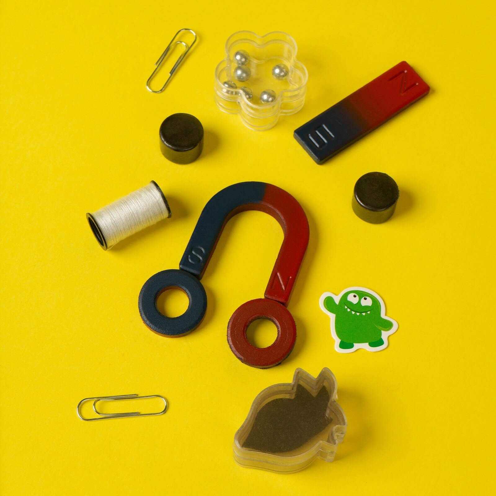 | Комплектация | 6 магнитов. Катушка ниток. Металлические шарики. Металлическая стружка. Бумажные карточки. |