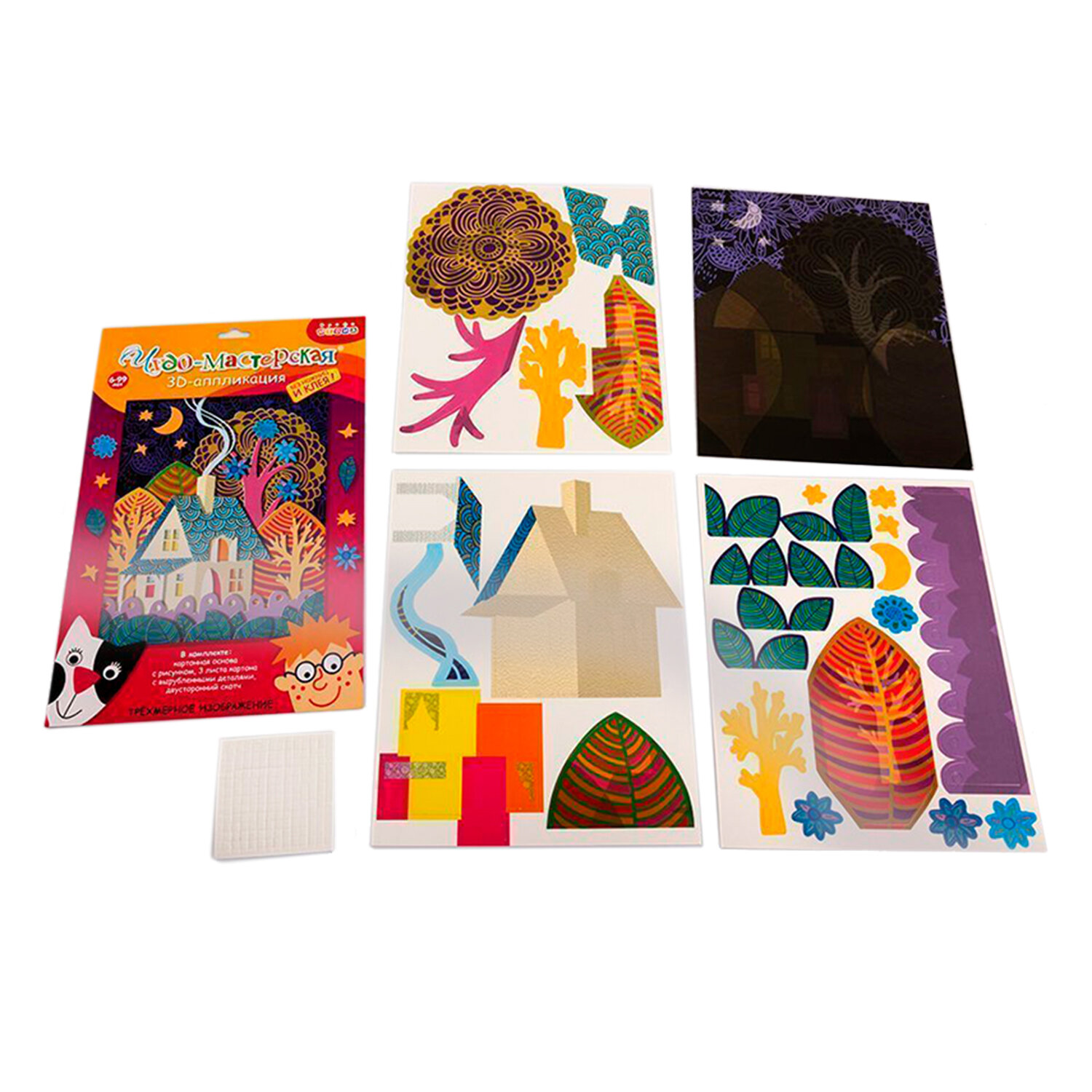 | Комплектация | - цветная основа с рисунком и схемой размещения деталей; - детали, вырубленные из цветного картона; - объёмный двусторонний скотч; - цветная листовка-образец. |