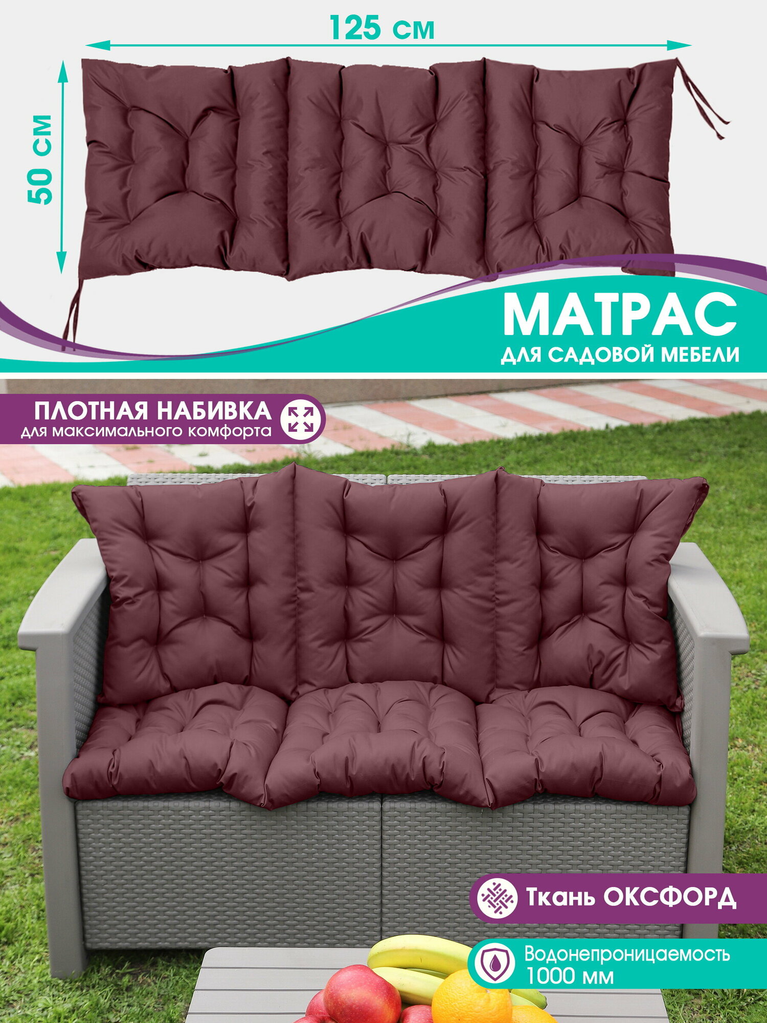 Матрас для садовых качелей, для подвесного кресла, на садовый диван 50х125 см с завязками, водонепроницаемый, бордо