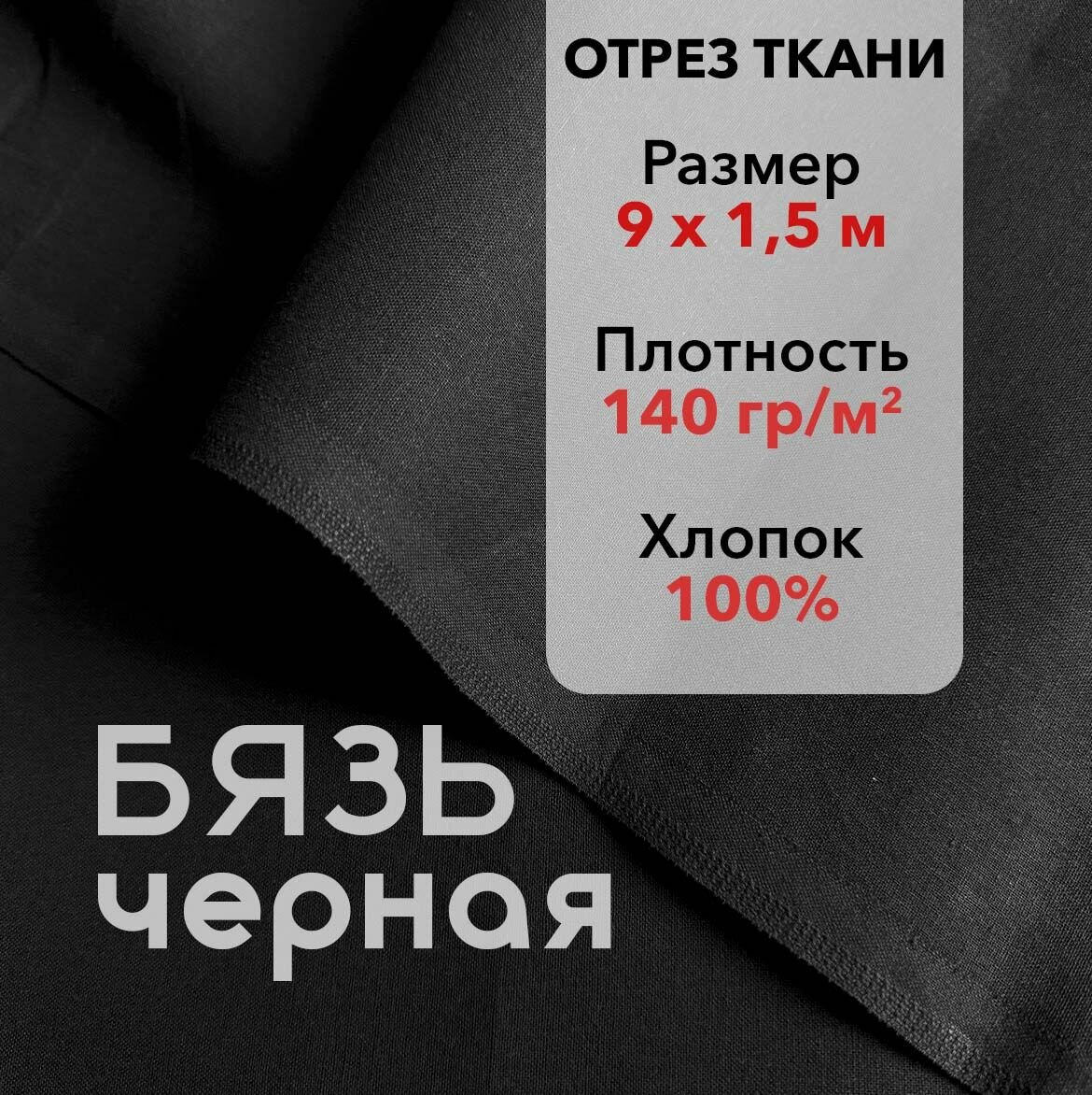 Ткань Бязь Черная, отрез 9 м, хлопок 100%, шир 150 см, плотность 140 г/м, Ткань для шитья и рукоделия