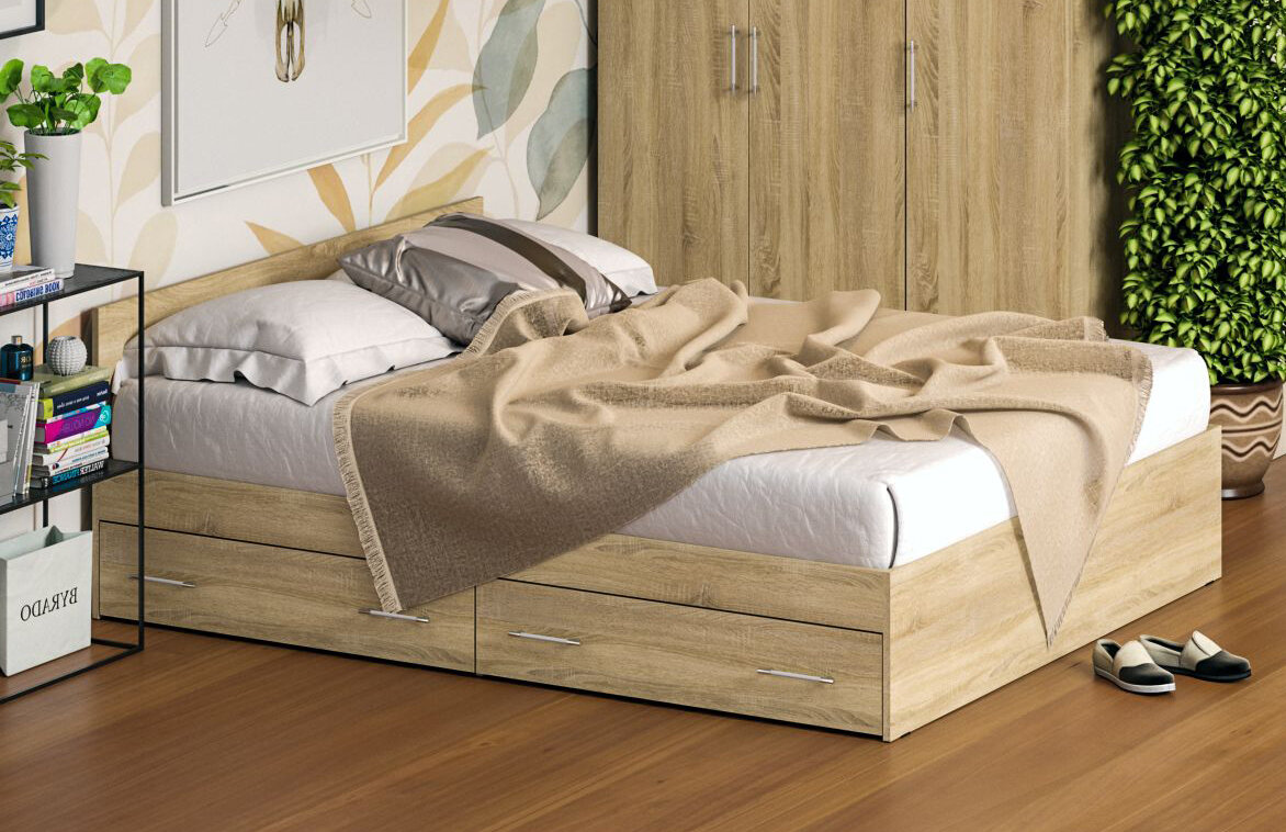 Кровать с ящиками СВК "Стандарт" 90х200см, цвет Дуб Сонома, с жестким основанием, без матраса