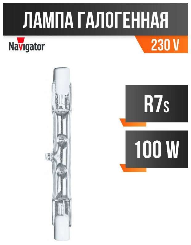 (1 шт.) Галогенная лампочка Navigator J78, мощность 150 Вт, напряжение питания 220 В, цветовая температура 2900 K, цоколь R7s, световой поток 120 Лм, диммируемая, размер ⌀ 7х78 мм