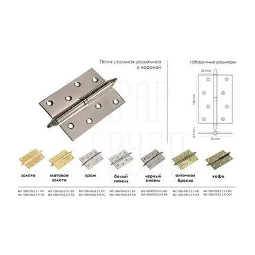 Петли дверные Morelli разъемные с короной MS100*70*2.5 L COF кофе, комплект 2 шт., петли металлические накладные для межкомнатных дверей