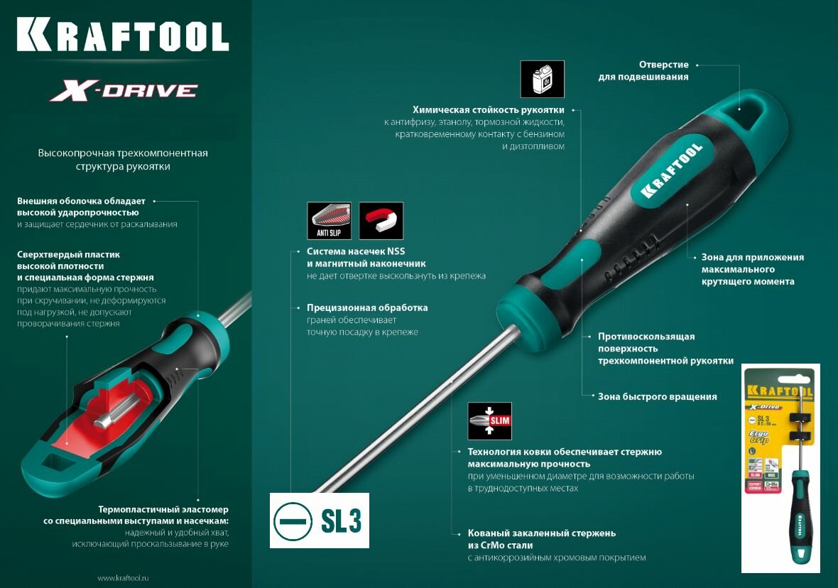 KRAFTOOL Х-Drive SL3x80 отвертка, 250071-3.0-080