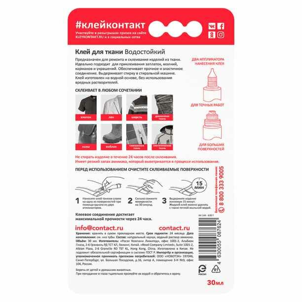 | Дополнительная информация | Клей контактный контакт для ткани 30 мл, арт.24275 |