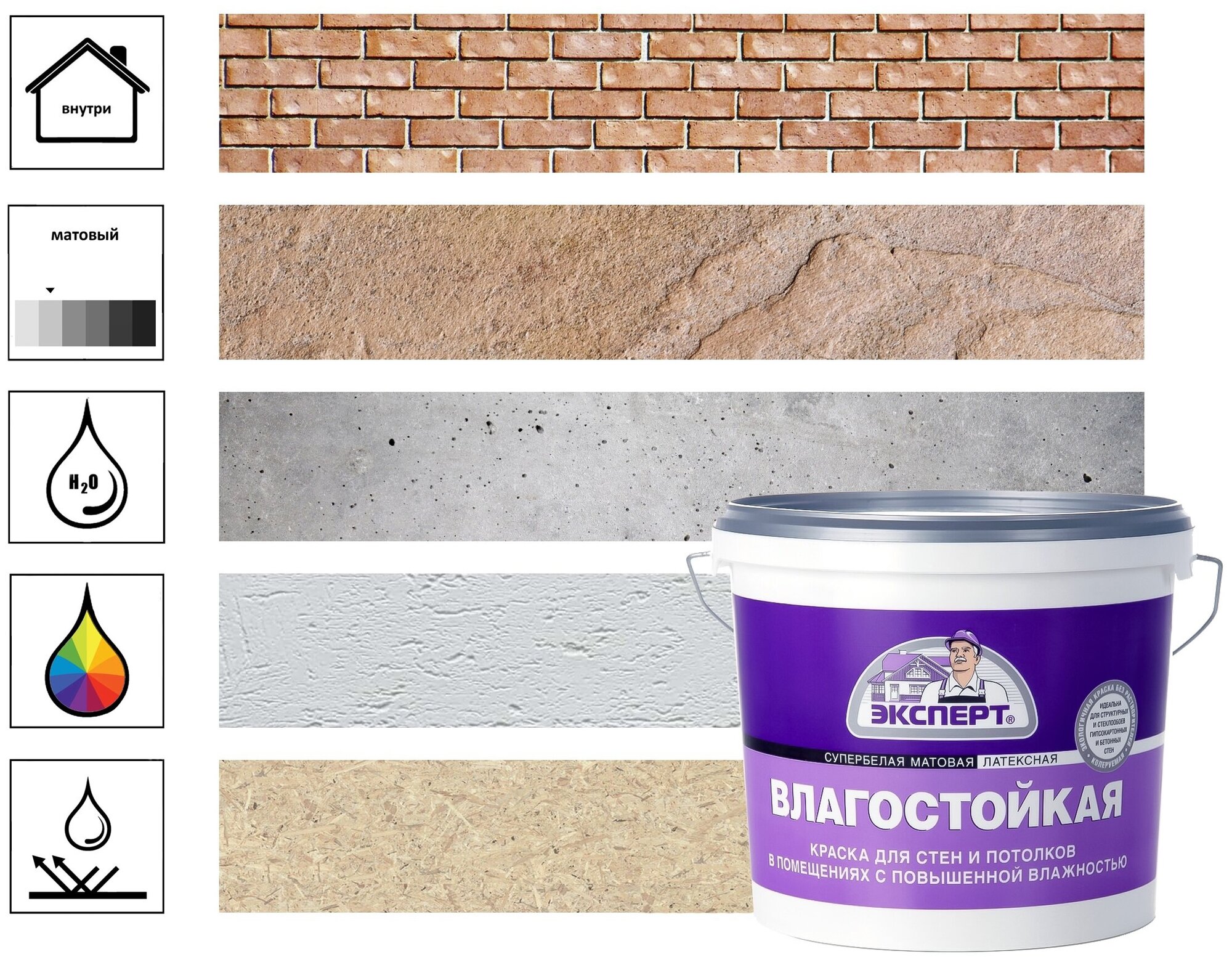 | Дополнительная информация | для окраски стен и потолков внутри сухих и влажных помещений |