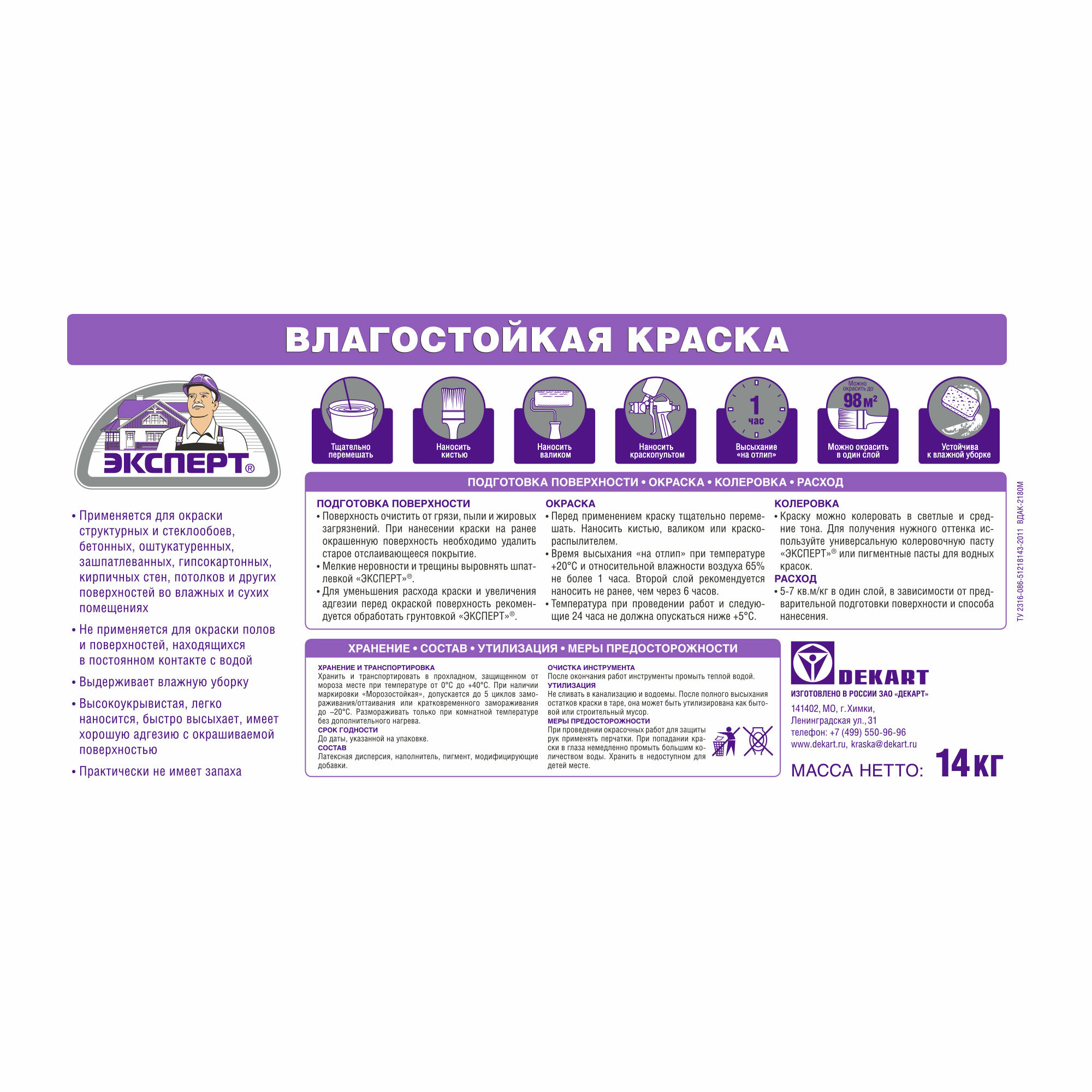 | Дополнительная информация | для окраски стен и потолков внутри сухих и влажных помещений |