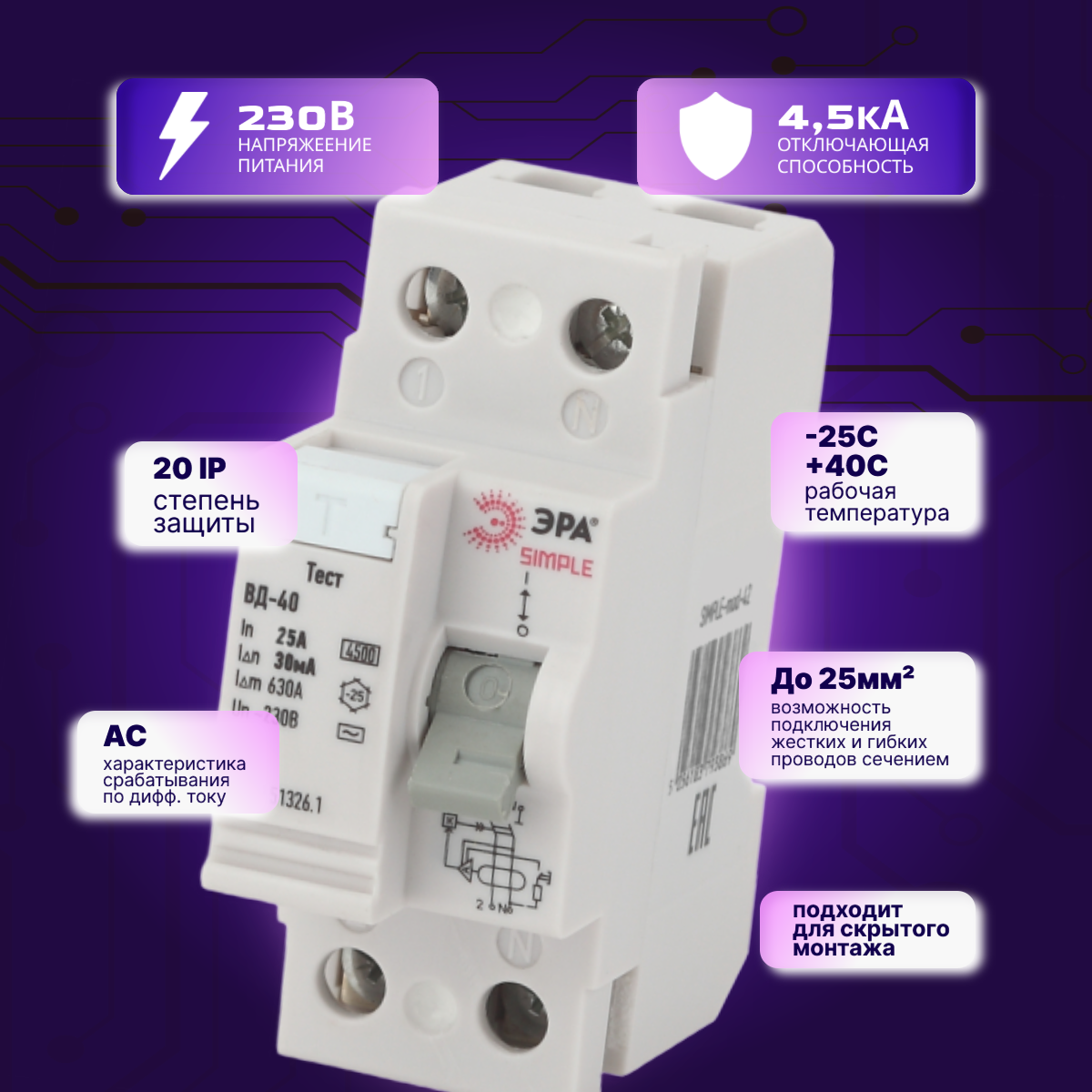Устройство защитного отключения (УЗО) Эра 2п 25А/30мА ВД-40 (электронное) SIMPLE-mod-42, Б0039262 интересное:
