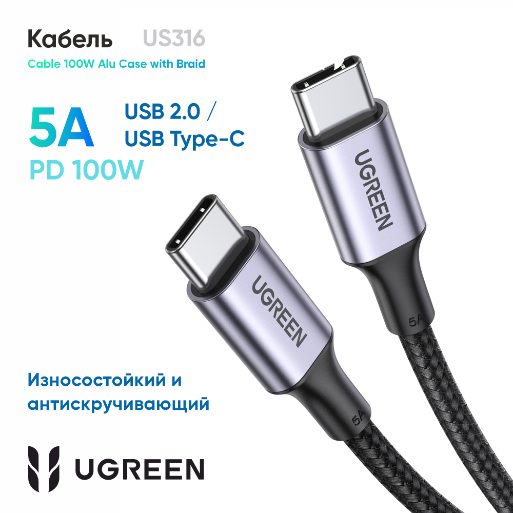 Кабель UGREEN US316 (70429) USB-C 2.0 to USB-C 2.0 5A Data Cable. Длина 2 м. Цвет: черный.