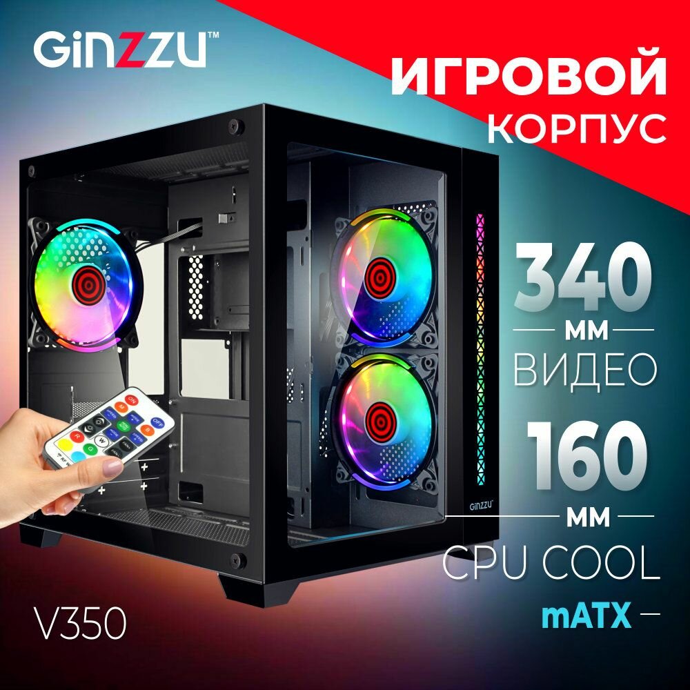 Корпус Ginzzu V350 mATX кубик RGB, закаленное стекло, вентиляторы 3*12CM RGB, Controller CRC06+ пульт ДУ интересное: