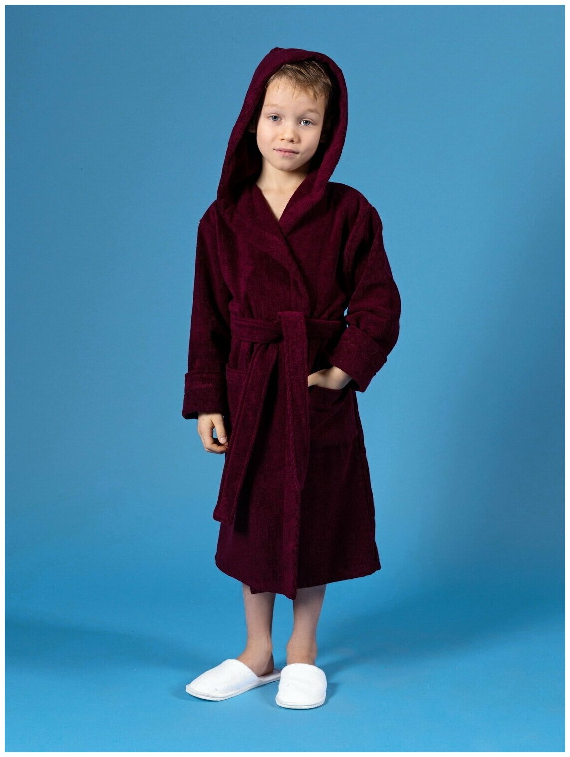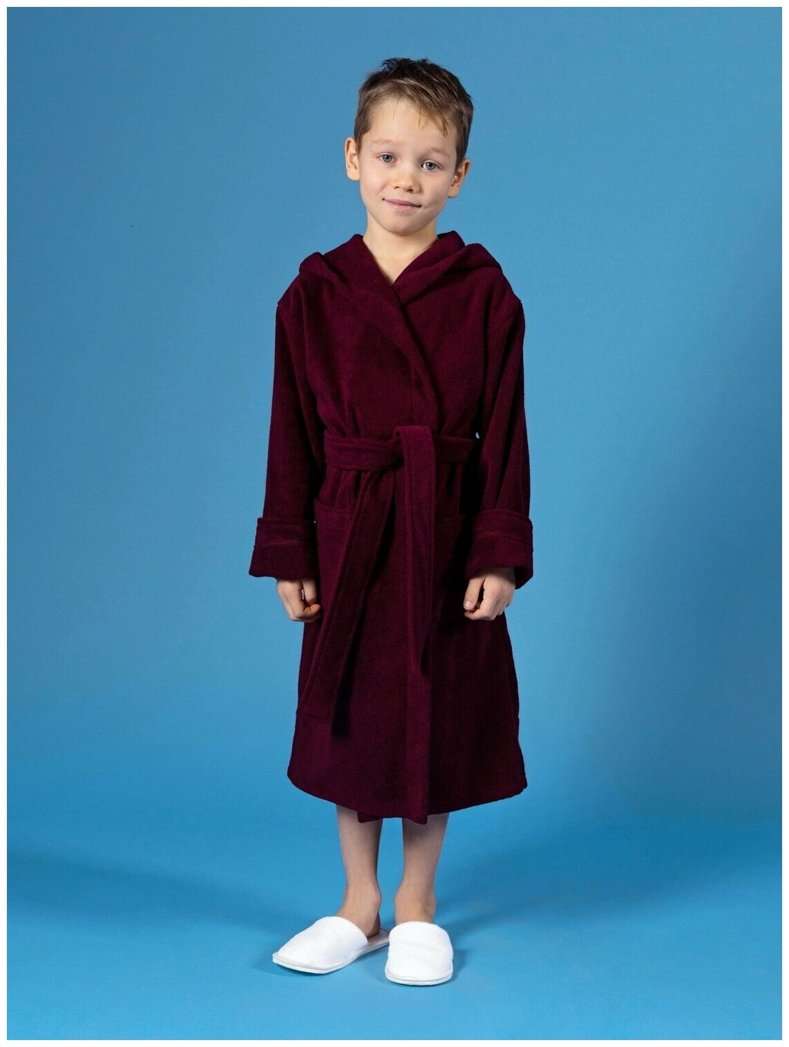 Детский махровый халат с капюшоном Росхалат, темно-бордовый. Размер 30-32