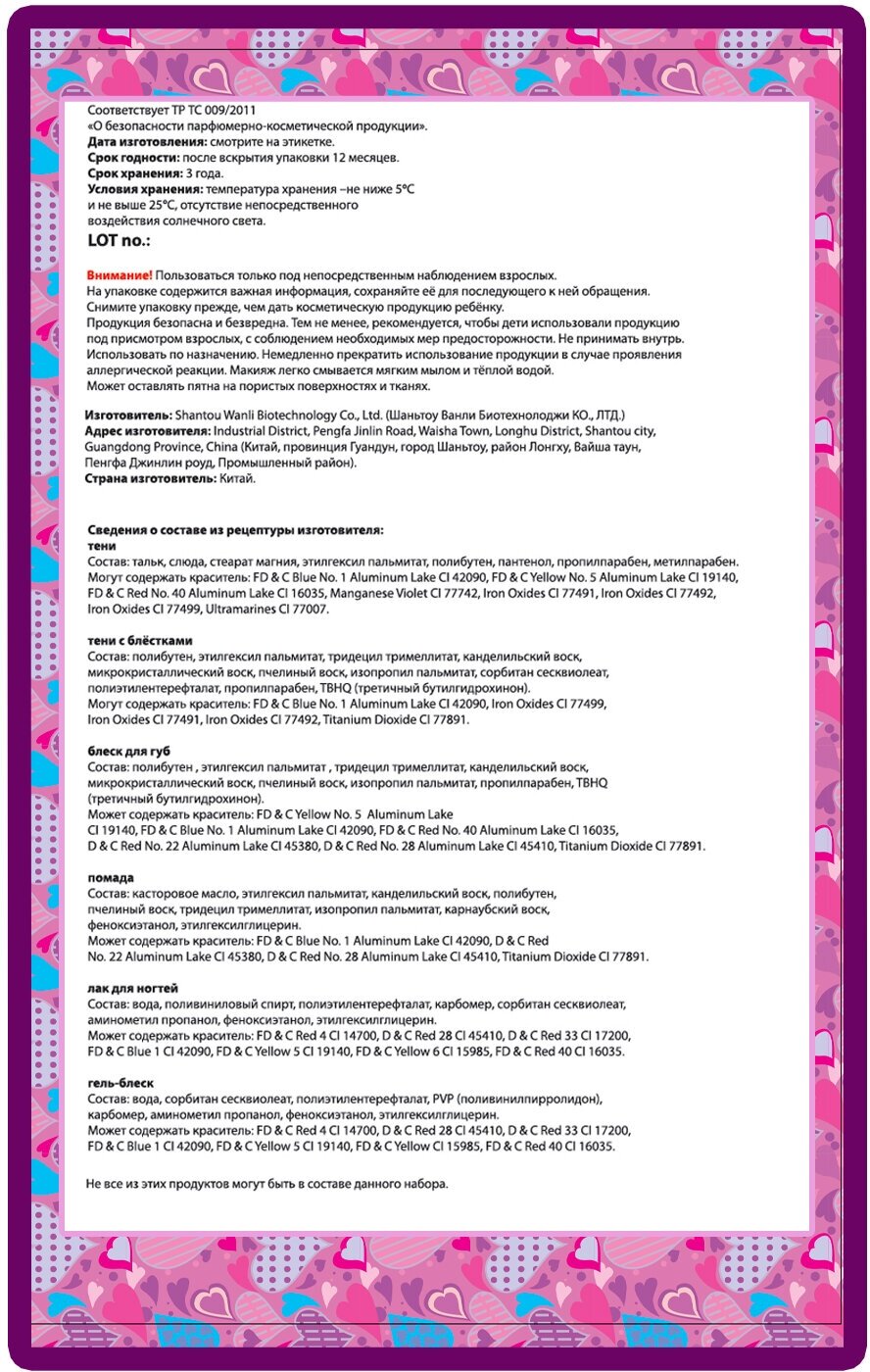 | Подробная комплектация | лаки для ногтей 3 оттенка (14,1г), украшения для ногтей самоклеющиеся пласт.стразы 24 шт., накладные ногти 12 шт., разделитель для пальцев EVA, пинцет 1 шт., пилочка для ногтей 1 шт., палочка для ногтей 1 шт. |
