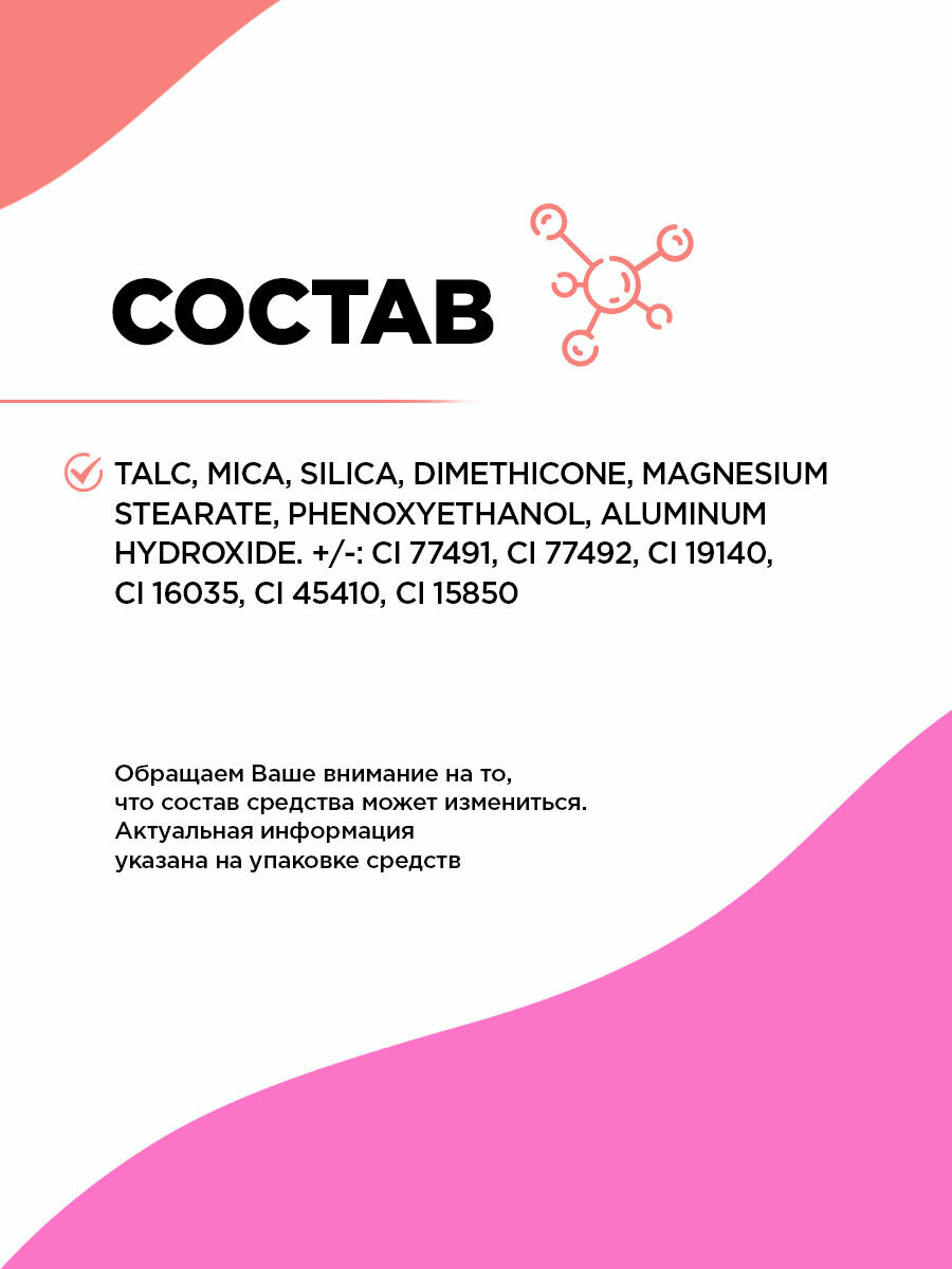 | Состав | TALC, MICA, SILICA, DIMETHICONE, MAGNESIUM STEARATE, PHENOXYETHANOL, ALUMINUM HYDROXIDE. +/-: CI 77491, CI 77492, CI 19140, CI 16035, CI 45410, CI 15850. |