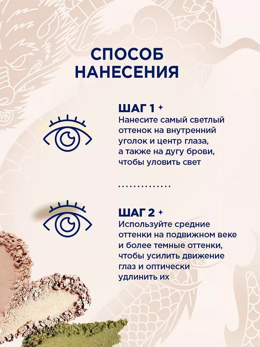 | Способ применения | Нанесите тени на веки и растушуйте границы. |