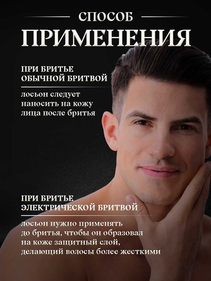 | Способ применения | Применяется до или после бритья. Нанести на лицо и шею легкими похлопывающими движениями. Лосьон после бритья можно использовать при бритье как обычной бритвой, так и электрической. Отличие заключается лишь в способе применения. Если вы пользуетесь обычным бритвенным станком, то лосьон следует наносить на кожу лица после бритья. Если же предпочитаете электрическую бритву, то лосьон нужно применять до бритья, чтобы он образовал на коже защитный слой, делающий волосы более жесткими. Это способствует более легкому удалению волос и меньшей степени травмирования кожи. |