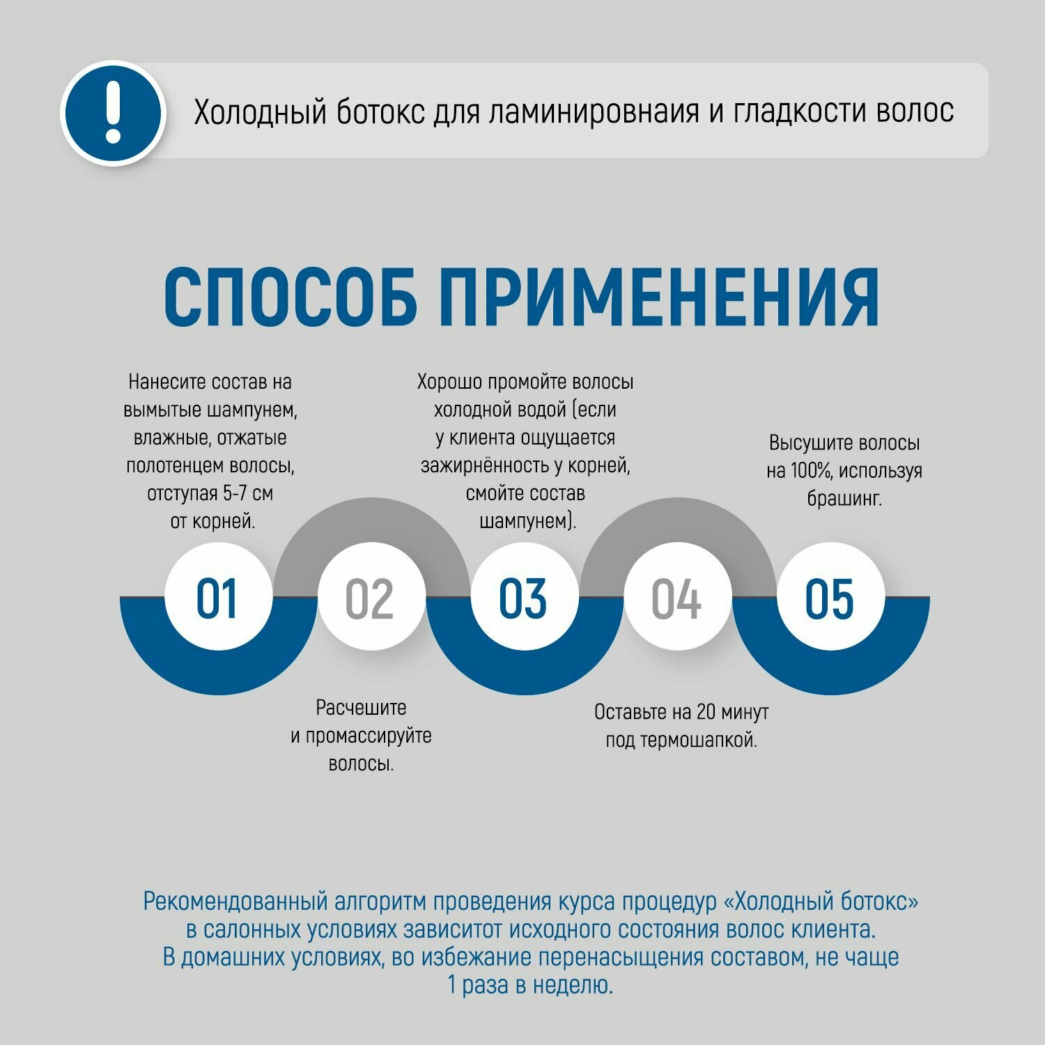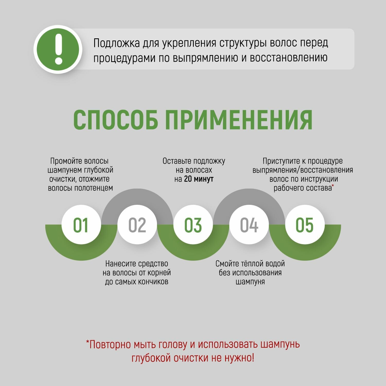 | Способ применения | Использование в качестве подложки перед процедурой: 1. Нанесите продукт массирующими движениями от корней до кончиков на влажные чистые волосы. Распределите по всей длине, уделяя особое внимание поврежденным кончикам. 2. Выдержите маску-подложку 15-20 минут на волосах. 3. Промойте волосы тёплой водой. Далее приступите к выпрямлению, тонированию, окрашиванию, восстановлению или химической завивке волос согласно инструкции вашего рабочего состава. Использование в качестве маски: 1. Нанесите продукт на влажные чистые волосы, отступая 2-3 см от кожи головы. Распределите по всей длине, уделяя особое внимание поврежденным кончикам. 2. Выдержите 15-20 минут на волосах. 3. Промойте волосы тёплой водой и высушите их феном. |