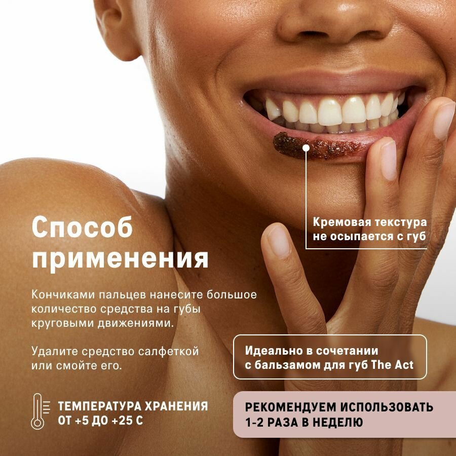 | Способ применения | Нанесите на кожу губ небольшое количество скраба легкими движениями, помассируйте, смойте скраб теплой водой. Используйте 1-2 раза в неделю или при необходимости дополнительного разглаживания кожи перед макияжем. Для наилучшего результата в качестве завершающего этапа ухода воспользуйтесь бальзамом для губ The Act с высоким содержанием пантенола, пептидом и комплексом натуральных масел. |