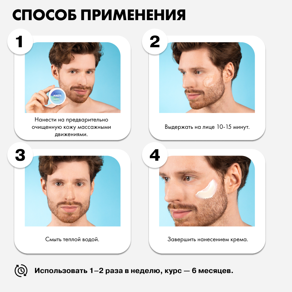 | Способ применения | Нанести на предварительно очищенную кожу массажными движениями, выдержать на лице 10-15 минут, далее смыть теплой водой, завершить нанесением крема. Использовать 1-2 раза в неделю, курсом 6 месяцев. |