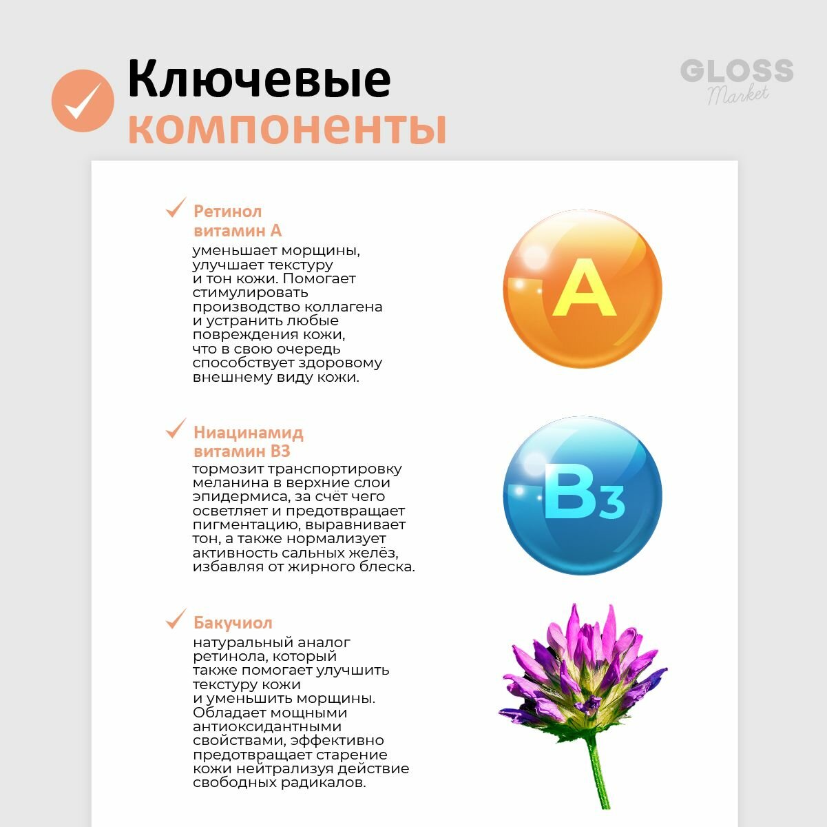 | Активный ингредиент | антиоксиданты / бакучиол / витамины / коллаген |