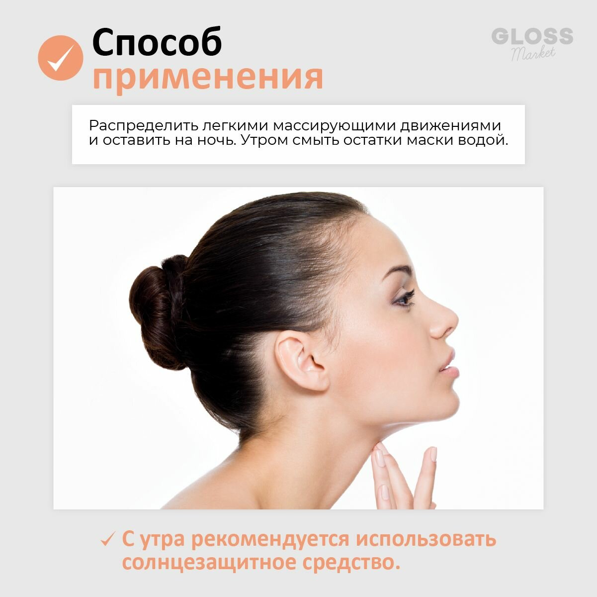 | Способ применения | Вскройте саше и нанесите содержимое на предварительно тонизированную кожу, желательно после использования сыворотки. Рекомендуется наносить средство не позже чем за 15-20 минут до сна и равномерно распределить. Утром смойте маску теплой проточной водой, продолжите ежедневный уход. При использовании косметики с ретинолом обязательно использование солнцезащитного средства! |