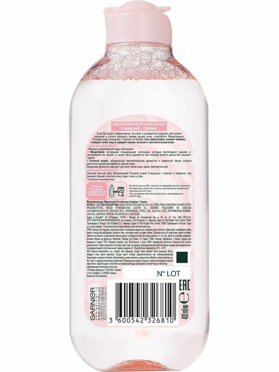 Garnier Мицеллярная Розовая вода, Очищение+Сияние, для тусклой и чувствительной кожи, 700мл