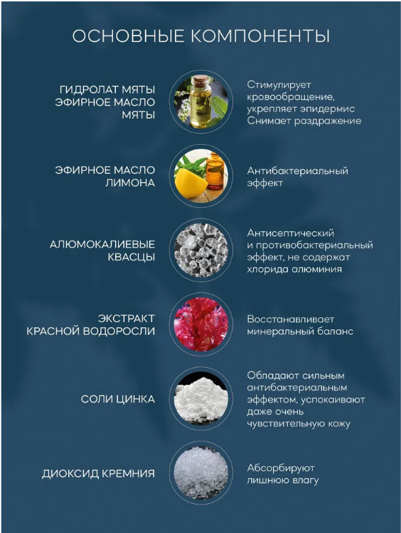 | Полный состав | Aqua (Вода), Citrus Reticulata Fruit Water (Гидролат мандарина), Potassium Alum (Алюмокалиевые квасцы), Glycerin (Глицерин), Silica (Минеральный сорбент), Glyceryl Caprylate (Растительный эмолент), Zinc Oxide (Минеральный сорбент), Propylene Glycol (Кондиционирующий агент натурального происхождения), Ванилин (Vanillin), Betaine (Бетаин), Zn PCA (Компонент НУФ), Lonicera Caprifolium Extract, Lonicera Japonica Extract (Экстракты жимолости), Parfum (Натуральная парфюмерная композиция), Sclerotium Gum (Камедь склероции), Carrageenan (Экстракт красной водоросли), Menthyl Lactate (Охлаждающий компонент), Xanthan Gum (Ксантановая камедь), Tocopherol, Beta-Sitosterol, Squalene (Антиоксиданты), Sodium Bicarbonate (Сода пищевая). |