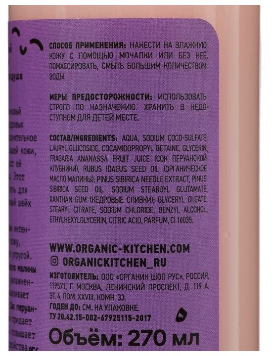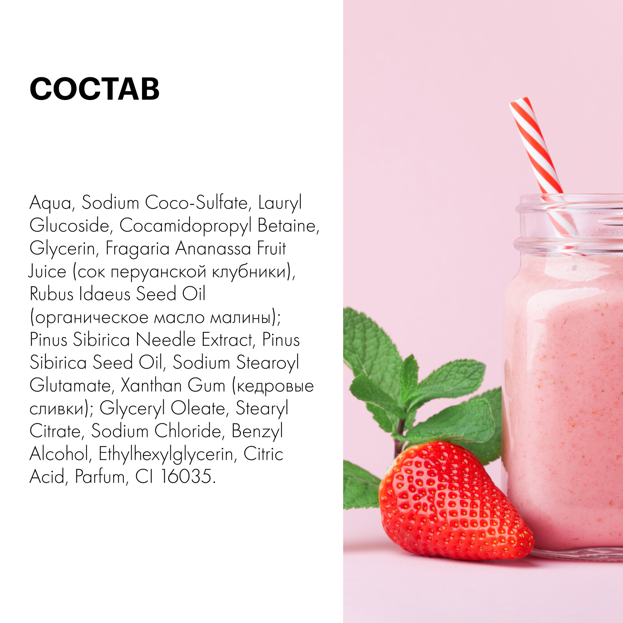 | Состав | Aqua, Sodium Coco-Sulfate, Lauryl Glucoside, Cocamidopropyl Betaine, Glycerin, Fragaria Ananassa Fruit Juice (сок перуанской клубники), Rubus Idaeus Seed Oil (органическое масло малины); Pinus Sibirica Needle Extract, Pinus Sibirica Seed Oil, Sodium Stearoyl Glutamate, Xanthan Gum (кедровые сливки); Glyceryl Oleate, Stearyl Citrate, Sodium Chloride, Benzyl Alcohol, Ethylhexylglycerin, Citric Acid, Parfum, CI 16035. |