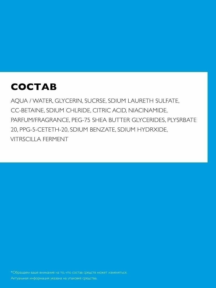 | Состав | AQUA/WATER, GLYCERIN (глицерин), SUCROSE, SODIUM LAURETH SULFATE, COCO-BETAINE, SODIUM CHLORIDE, CITRIC ACID, NIACINAMIDE (ниацинамид), PARFUM/FRAGRANCE, PEG-75 SHEA BUTTER (масло карите/ши), GLYCERIDES, POLYSORBATE 20, PPG-5-CETETH-20, SODIUM BENZOATE, SODIUM HYDROXIDE, VITROSCILLA FERMENT |