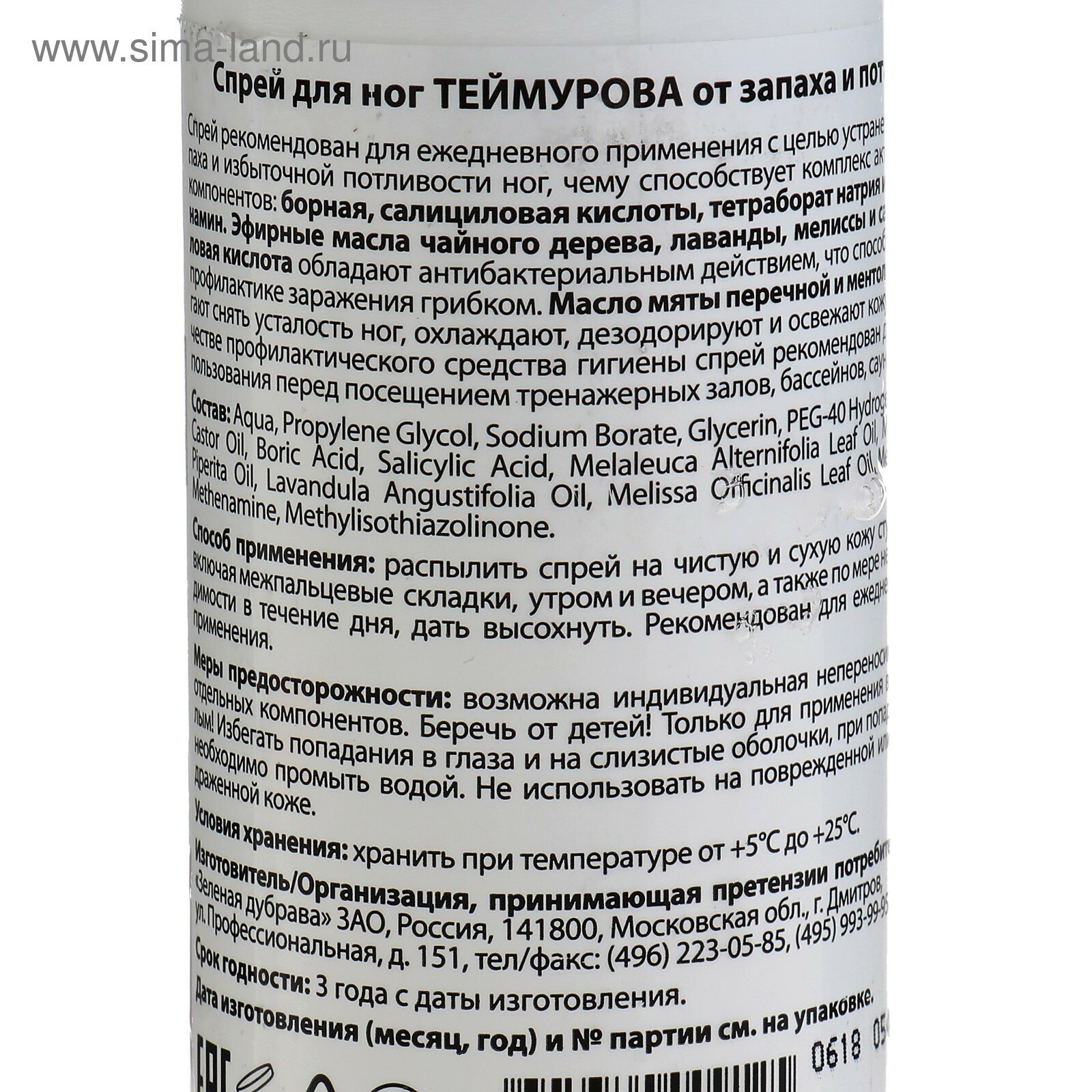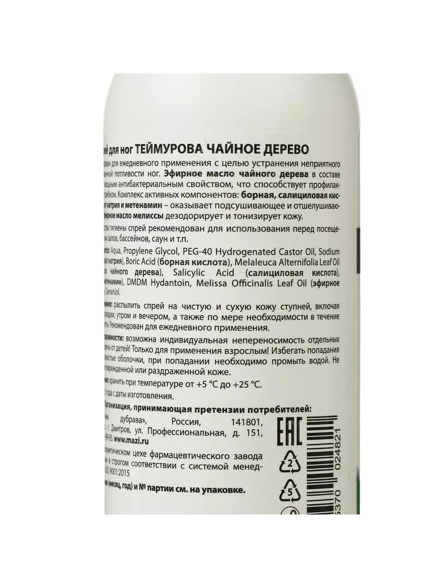 | Комплектация | Спрей для ног Теймурова от запаха и пота, чайное дерево, 150мл,3 шт |