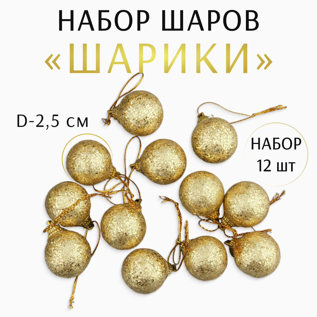 Ёлочные игрушки, шары новогодние , пластик, набор d-2,5 см, 12 шт "Шарики" золото