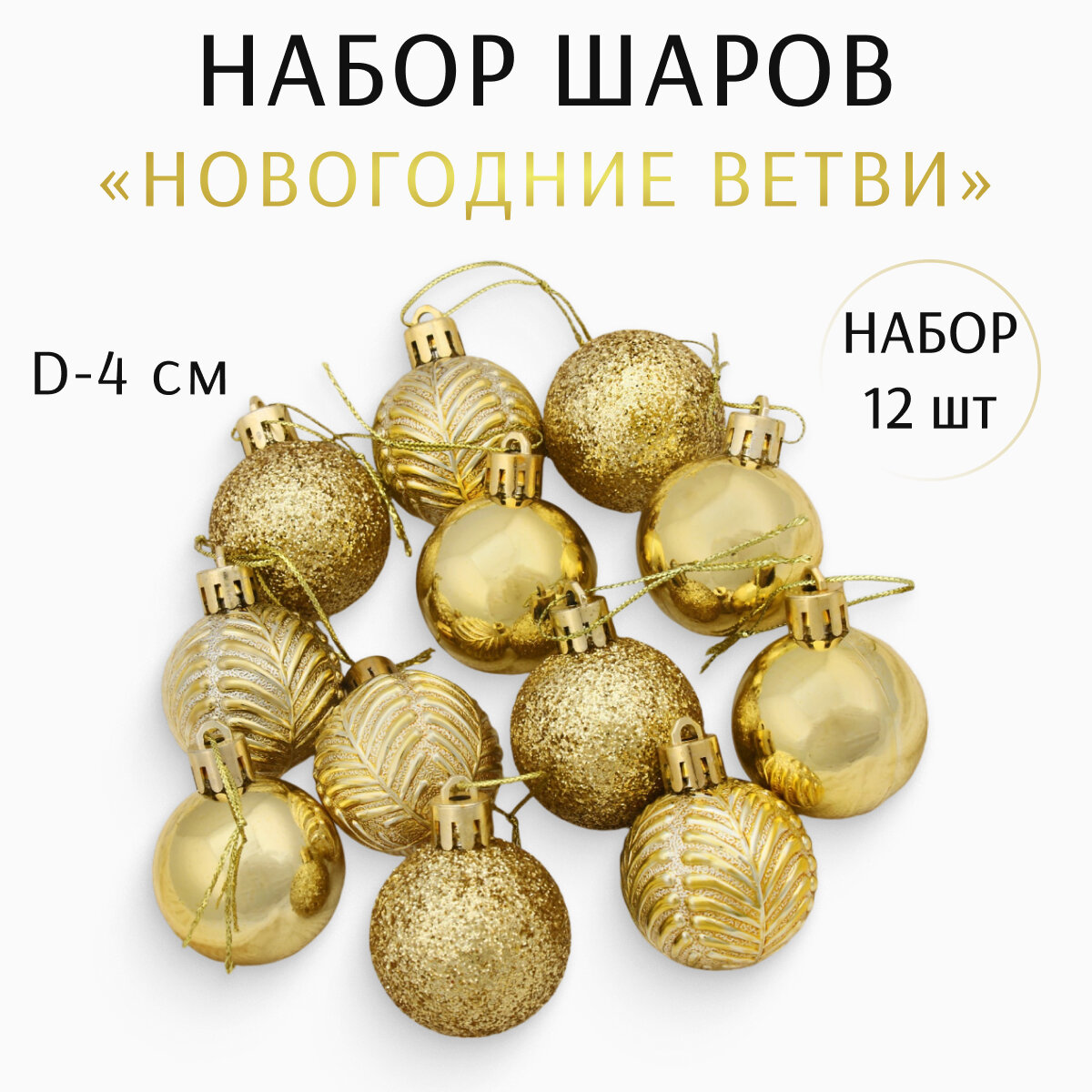 Набор ёлочных шаров пластик d-4 см, 12 шт "Новогодние ветви" золото