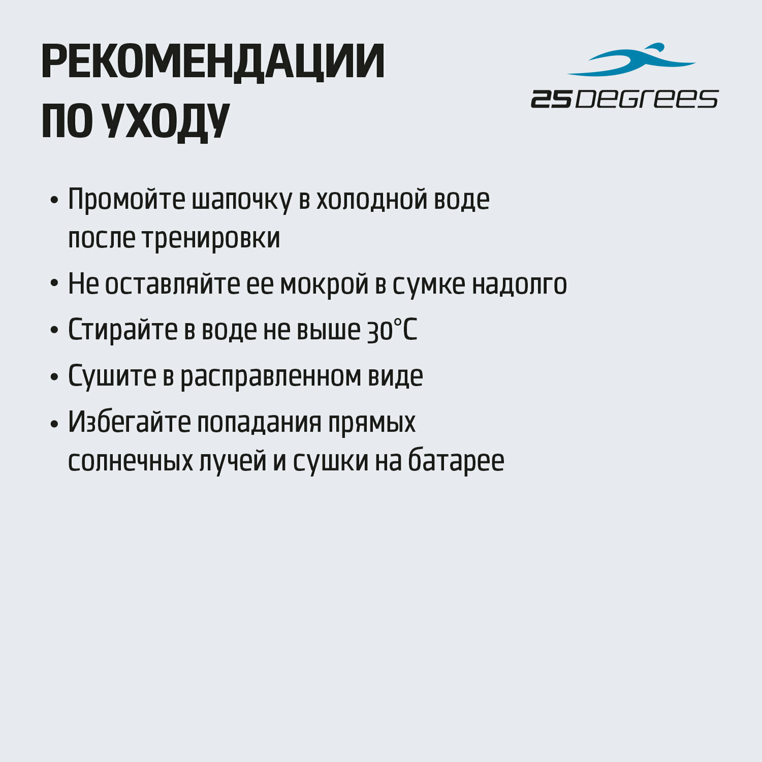 | Дополнительная информация | После тренировки необходимо прополоскать шапочку в холодной проточной воде; Стирать в воде не выше 30°С; Не рекомендуется оставлять мокрую шапочку в закрытой сумке надолго; Старайтесь избегать попадания прямых солнечных лучей на изделие |