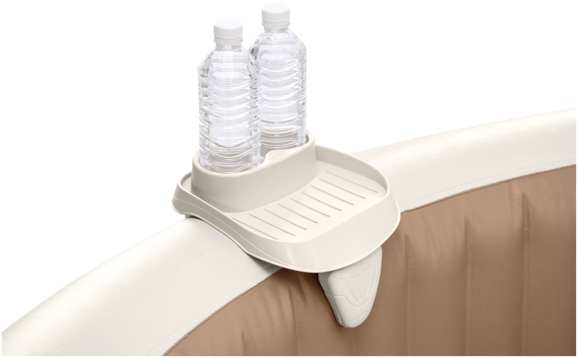 | Дополнительная информация | Подстаканник с поддоном используется для надувных джакузи Intex. Благодаря специальной форме и наличию резиновой основы надежно крепиться к джакузи. Позволяет ставить две ёмкости стандартных размеров с напитками, закуски, телефон или часы. Легко снимается и устанавливается. Сделан подстаканник PureSpa Cup Holder из высококачественного пластика, в той же цветовой гамме, что и внутренняя часть бассейна. |