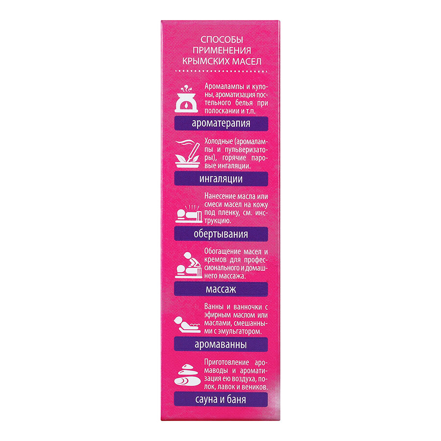 | Способ применения | Ароматерапия, ультразвуковой аромадиффузор, баня, ванна, косметика, массаж |