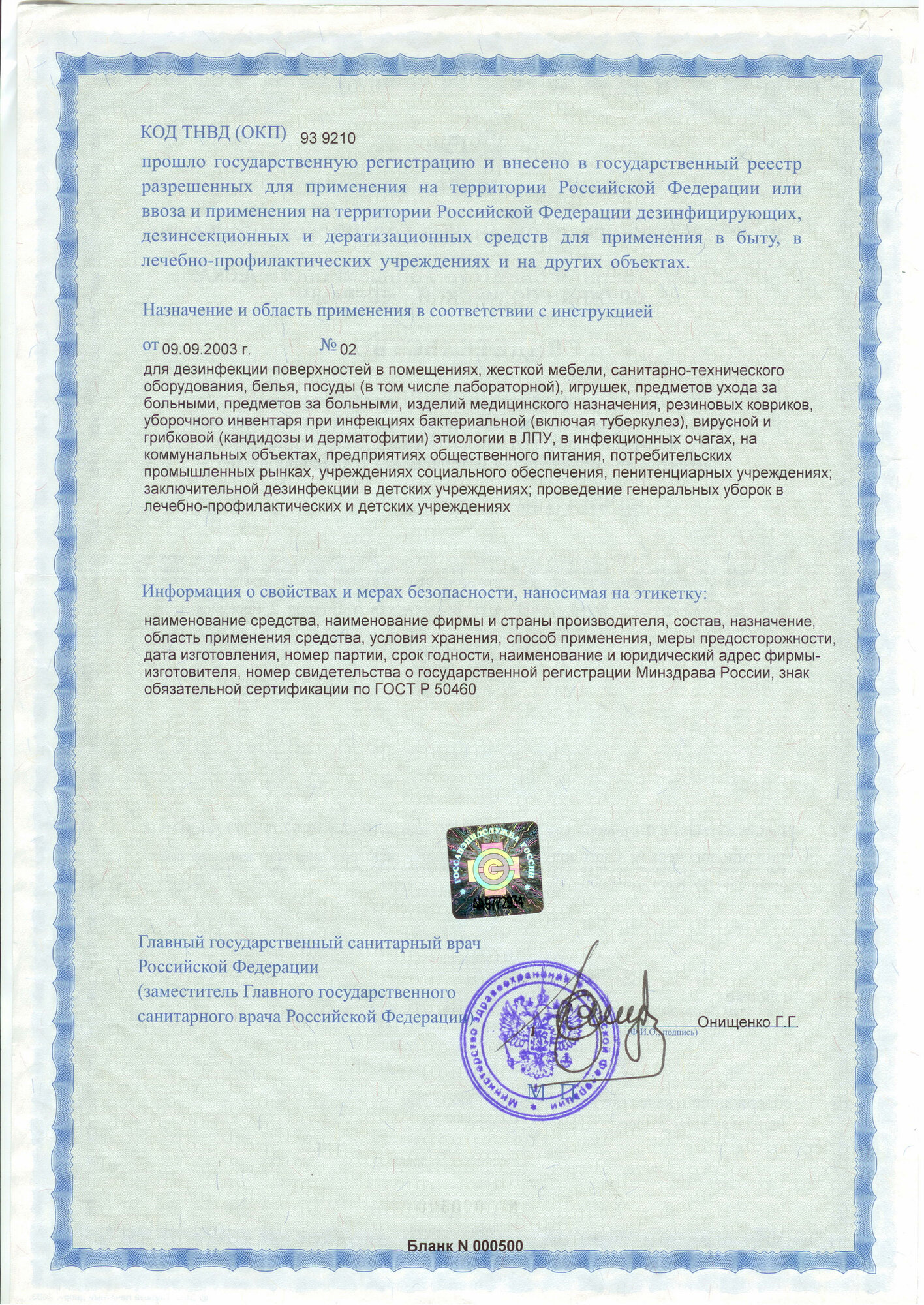 | Дополнительная информация | Средство обладает антимикробным и спороцидным действием в отношении бактерий (включая микобактерии туберкулеза), вирусов (включая гепатит В, ВИЧ), грибов рода Кандида и Трихофитон, особо опасных инфекций (сибирская язва, туляремия, чума, холера). |