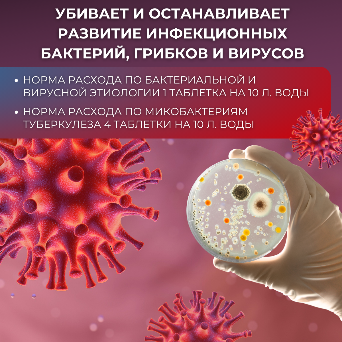 | Способ применения | норма расхода по бактериальной и вирусной этиологии 1 таблетка на 10 л. воды. Норма расхода по микобактериям туберкулеза 4 таблетки на 10 л. воды |