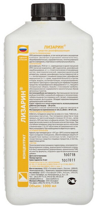 Ниже Вы можете прочитать отзывы на Средство дезинфицирующее Лизарин, для дезинфекции поверхностей, 1000 мл, ознакомится с подробными характеристиками, посмотреть интересные обзоры и фотографии на Средство дезинфицирующее Лизарин, для дезинфекции поверхностей, 1000 мл.