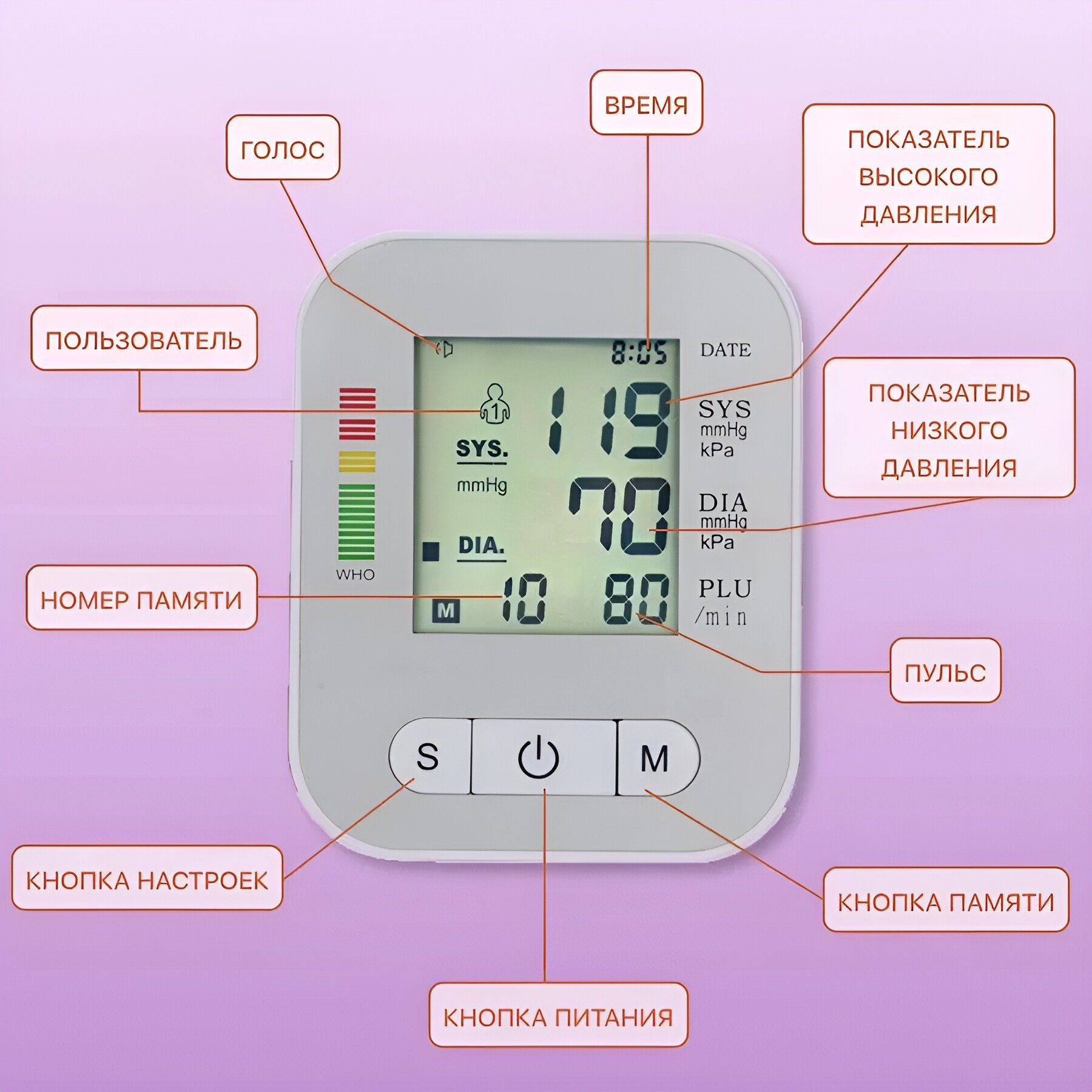 | Особенности | автоматическое отключение / безболезненная манжета / управление одной кнопкой / фиксация даты и времени |