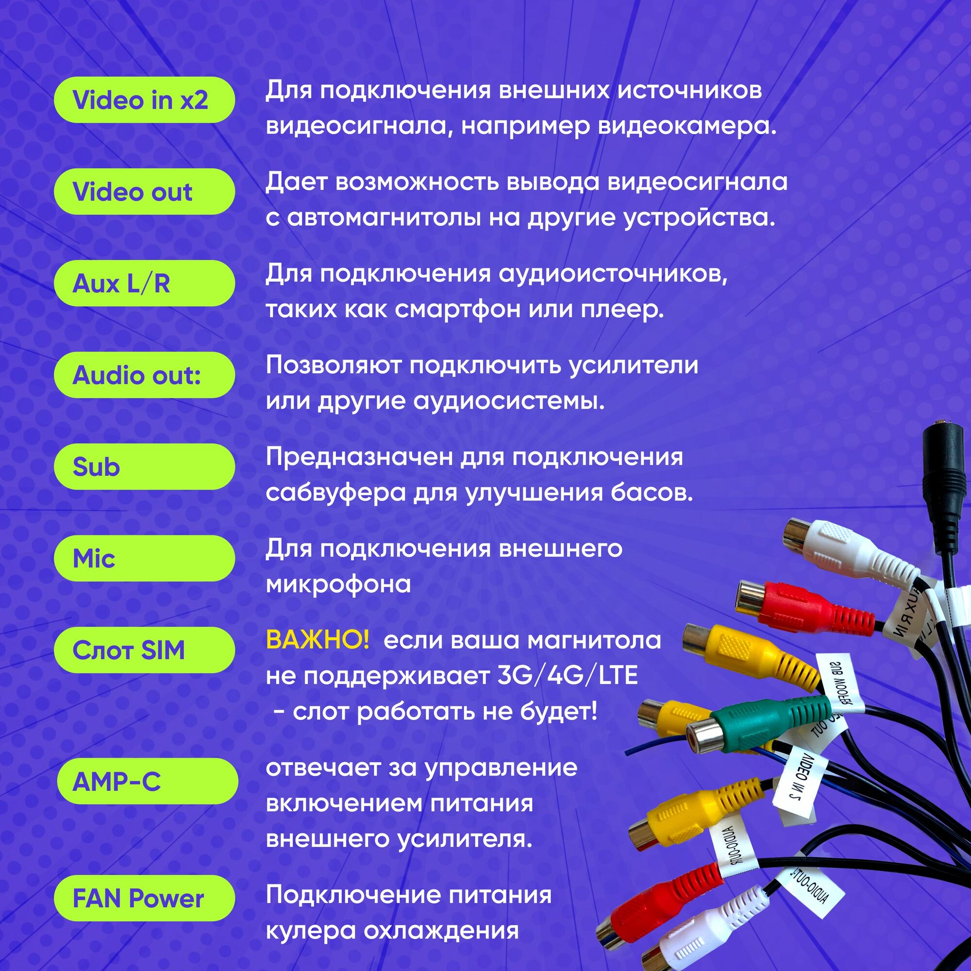 Разъём RCA 20 pin для автомагнитолы Андроид. Провода для усилителя и сабвуфера, подключение микрофона, усилителя, AUX, линейный выход для Android магнитолы Teyes. Кабель акустический интересное: