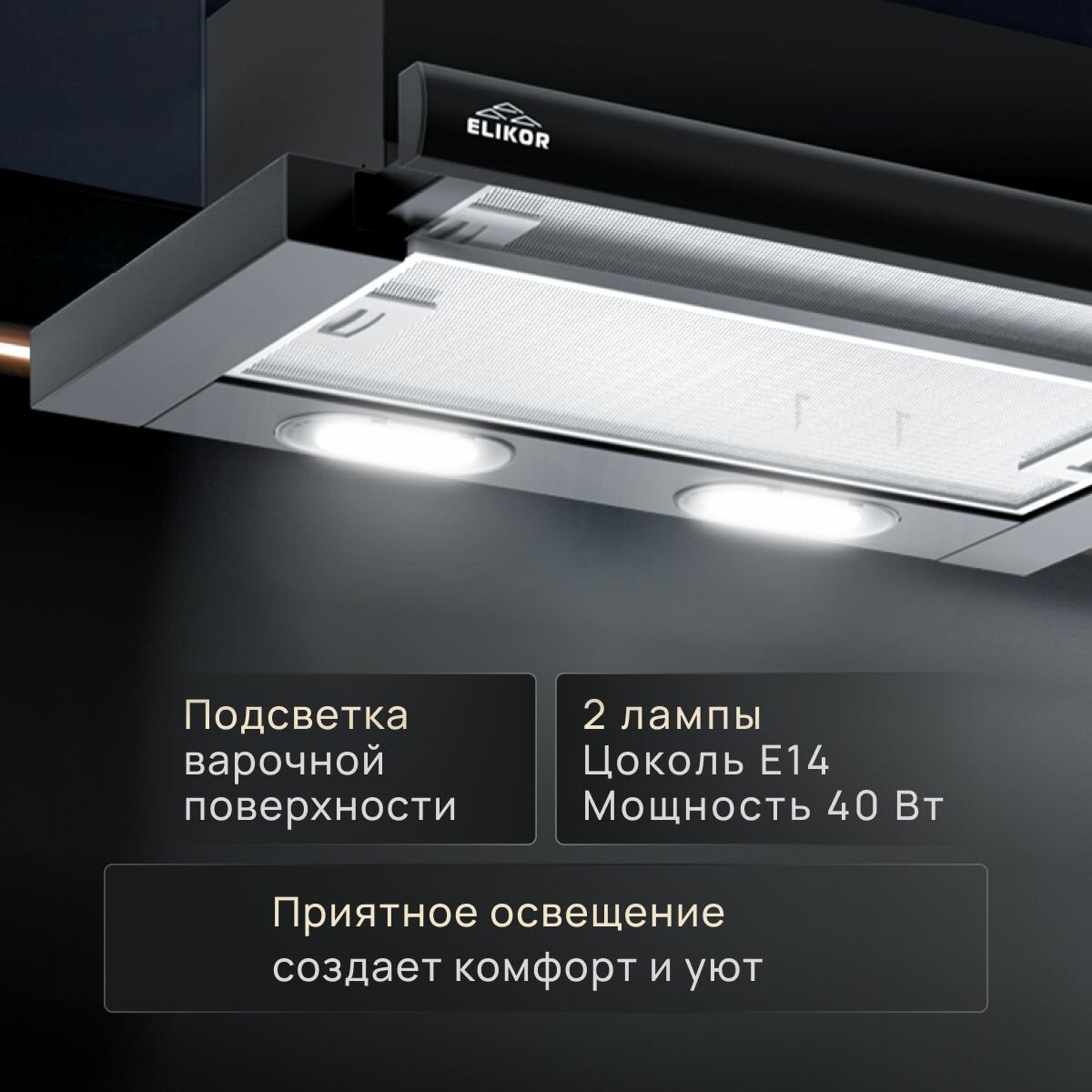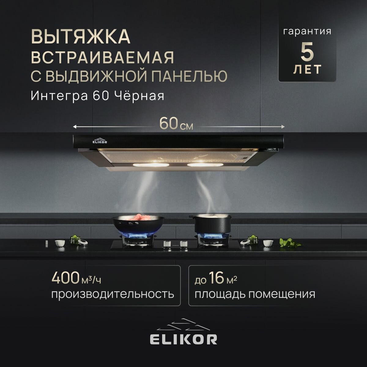Купить Вытяжка кухонная 60 см ELIKOR Интегра, встраиваемая, телескопическая, производительность - 400 м3/ч, управление клавишное, 2 скорости, лампы накаливания, черный