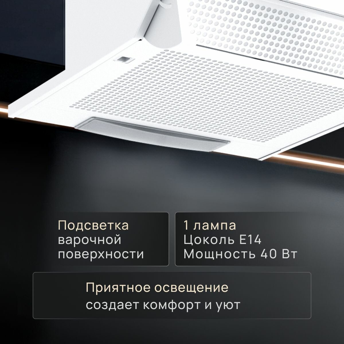 Вытяжка кухонная 50 см ELIKOR встраиваемая, врезной блок, производительность - 400 м3/ч, управление ползунковое, 3 скорости, светодиодные лампы, черный
