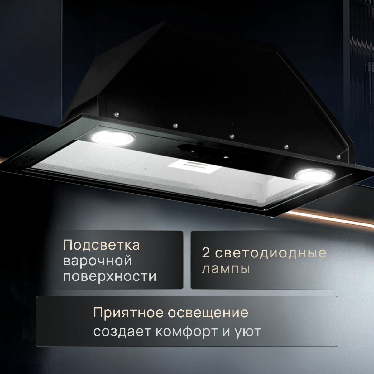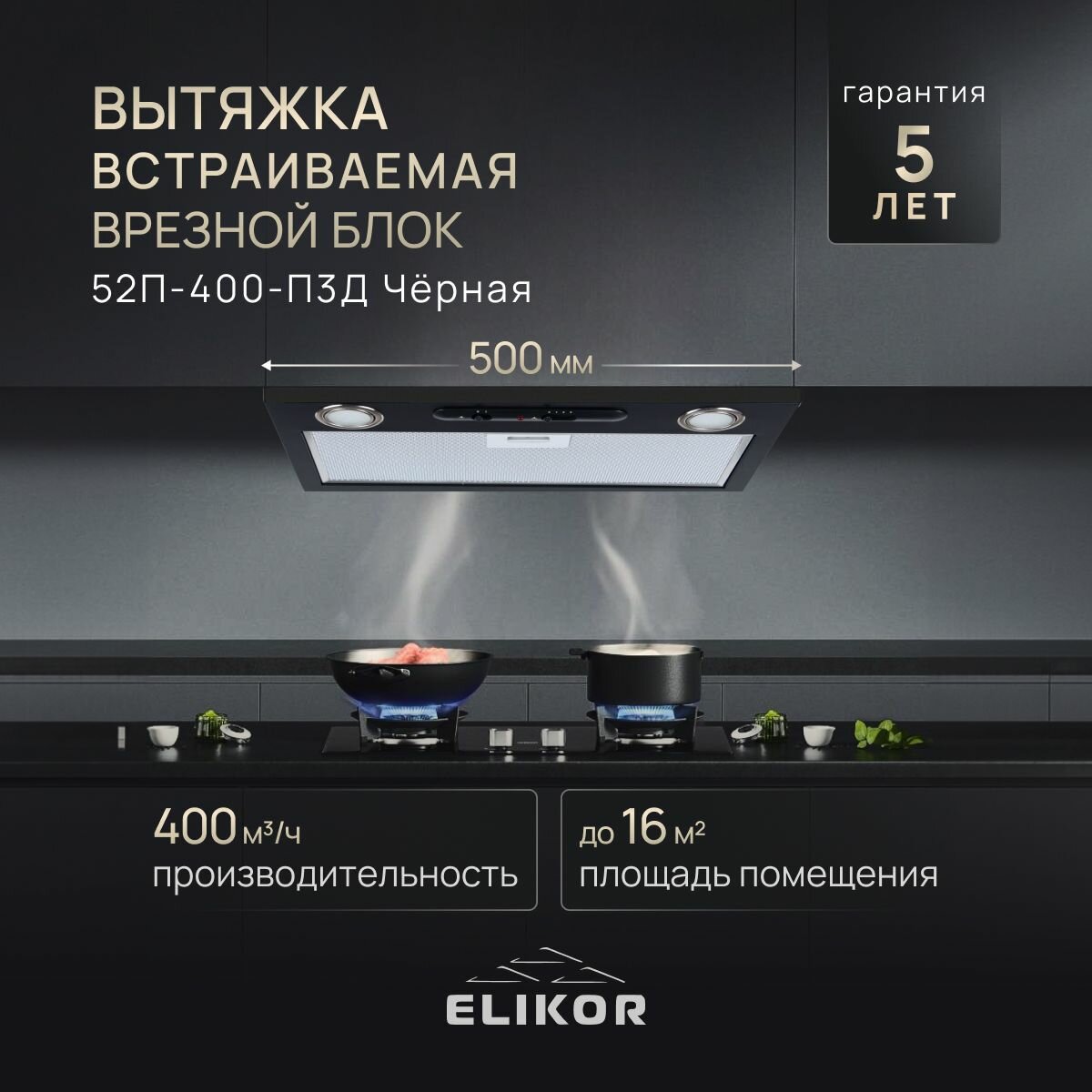 Купить Вытяжка кухонная 50 см ELIKOR встраиваемая, врезной блок, производительность - 400 м3/ч, управление ползунковое, 3 скорости, светодиодные лампы, черный