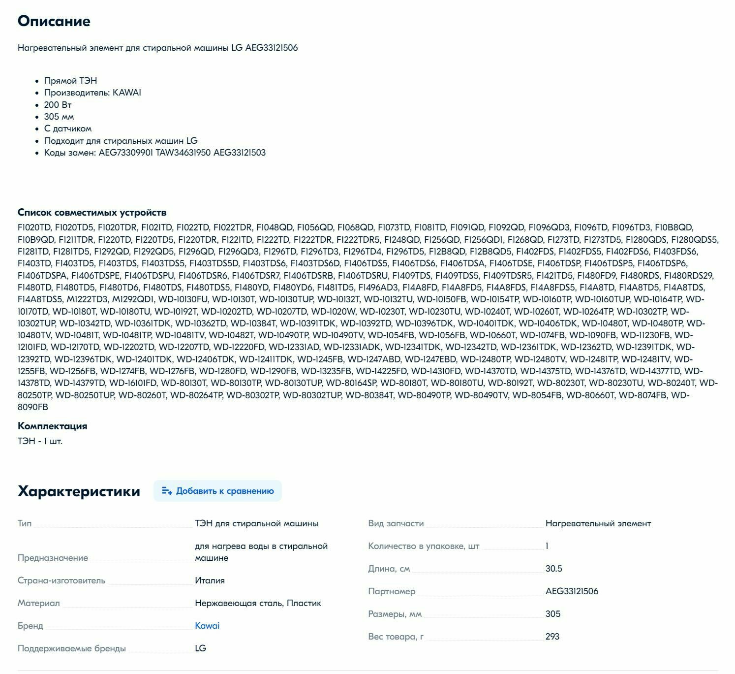 AEG33121503 Тэн для стиральной машины LG 2000 Вт 305 мм, с отверстием Kawai интересное: