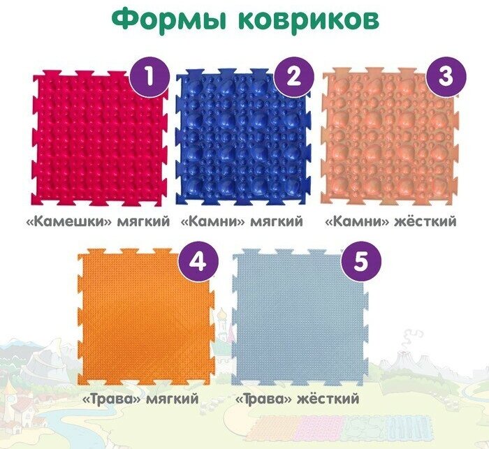 | Комплектация | 1. «Камешки», мягкие 1. «Камни», мягкие 1. «Камни», жёсткие 1. «Шишки», мягкие 1. «Ёлочка» левый след 1. «Ёлочка» правый след 1. «Льдинки», жёсткие 1. «Жёлуди», жёсткие 1. «Трава», мягкая 1. «Трава», жёсткая 1. «Шипы», мягкие 1. «Колючки», жёсткие 1. «Колючки», мягкие 1. «Лесенка», жёсткая 1. «Волна», жёсткая 1. «Островок», мягкий 1. «Мох», мягкий |