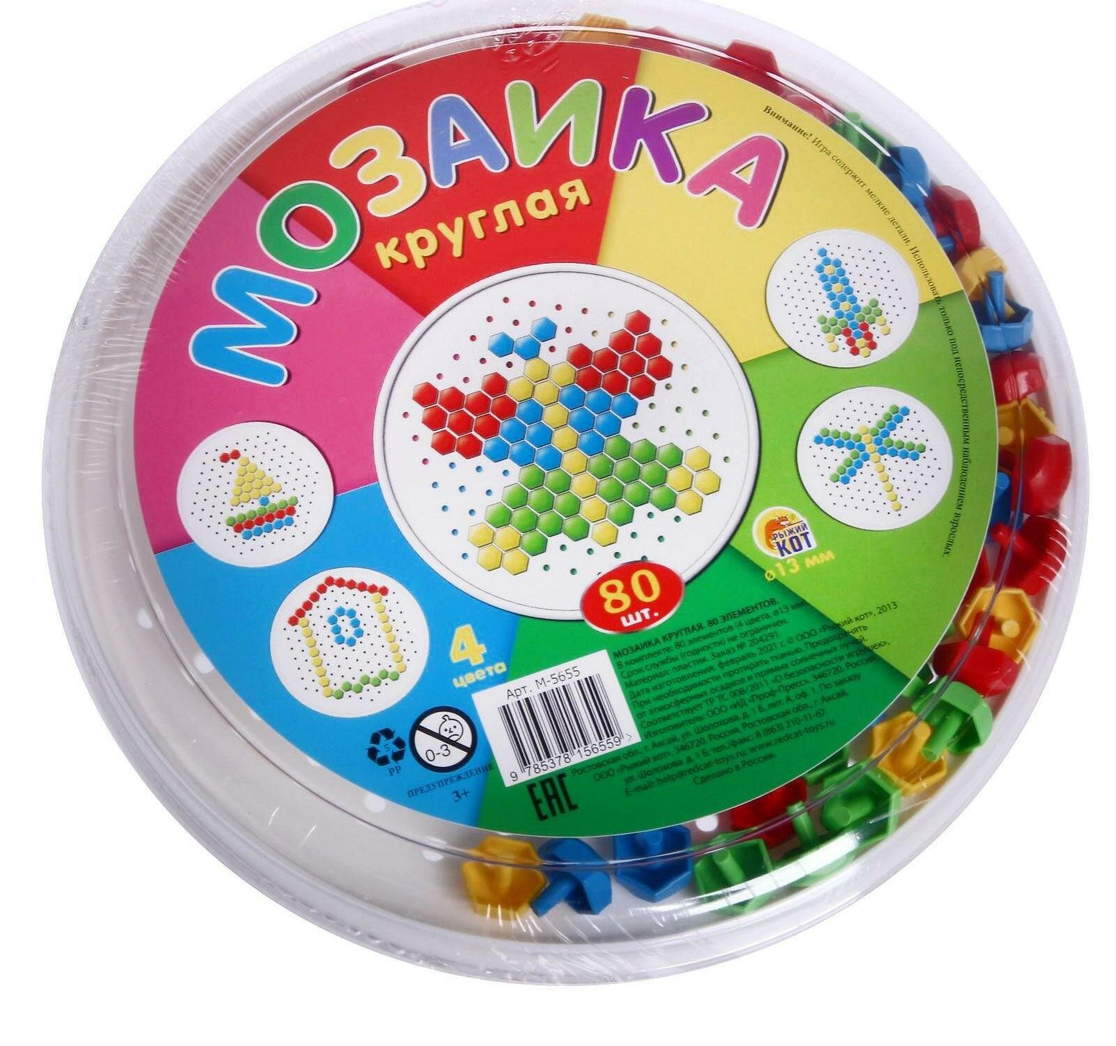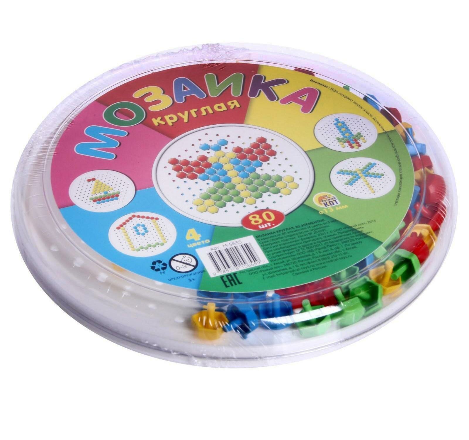 Мозаика 80 дет. (d=13мм, 4 цвета, круглая плата) (пластик) (от 3 лет) М-5655, (Рыжий кот)