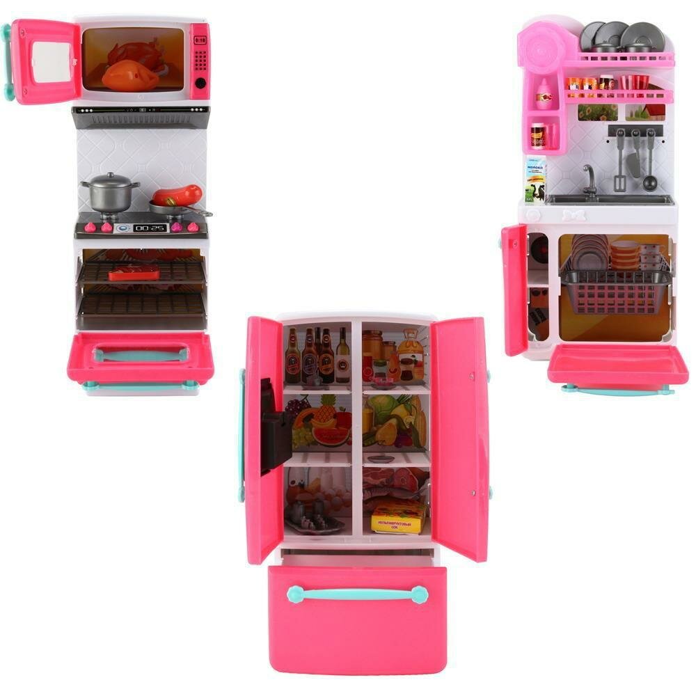 | В комплекте | вытяжка, духовой шкаф, игрушечная еда, кухонная утварь, микроволновая печь, плита, посуда, посудомоечная машина, раковина, холодильник |