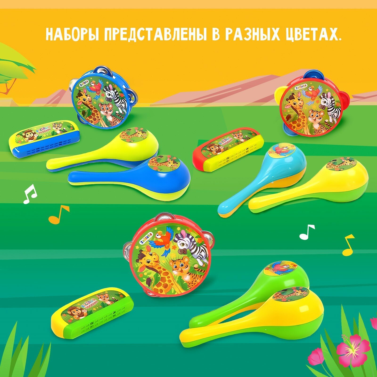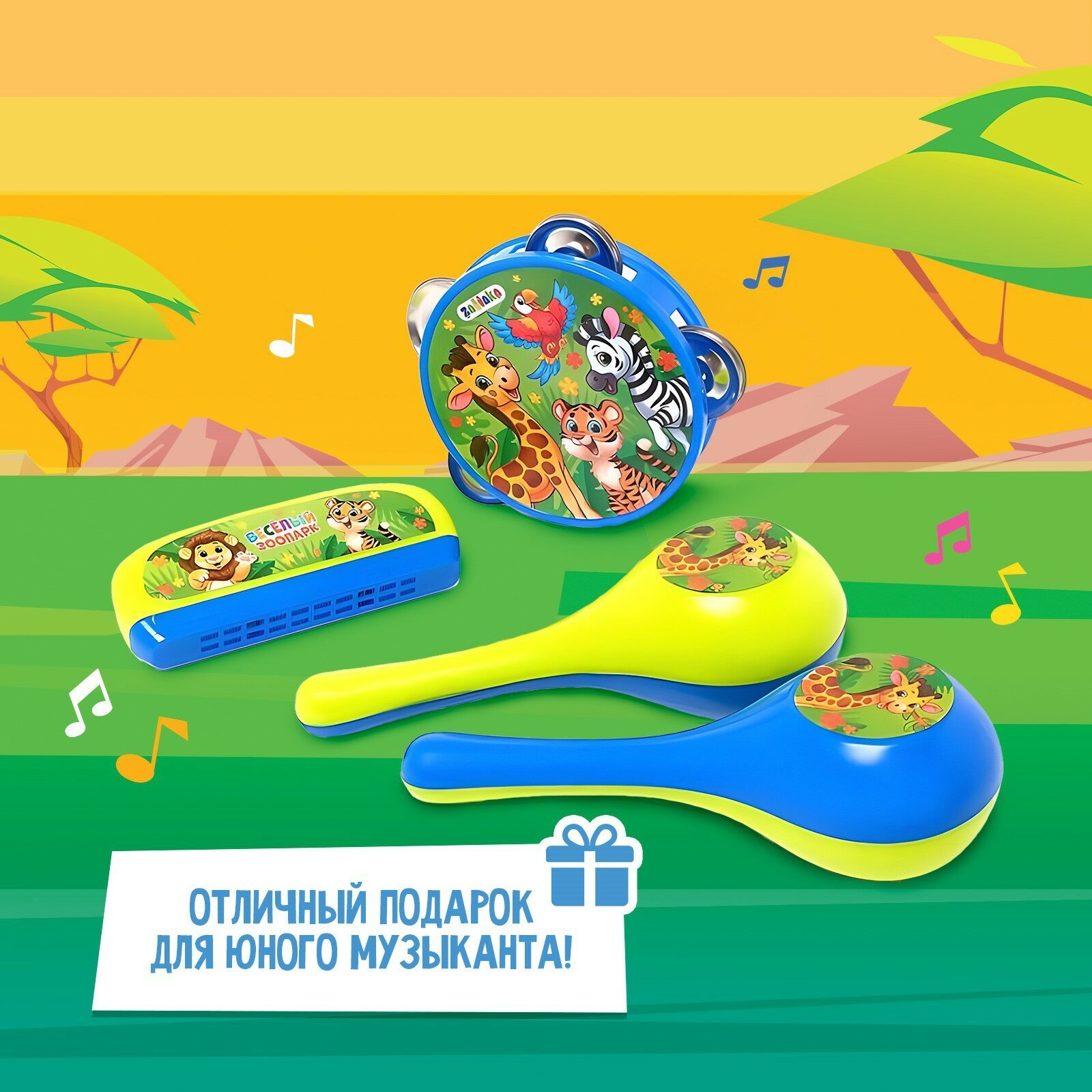 Набор музыкальных инструментов «Весёлый зоопарк»: бубен, 2 маракаса, губная гармошка, микс