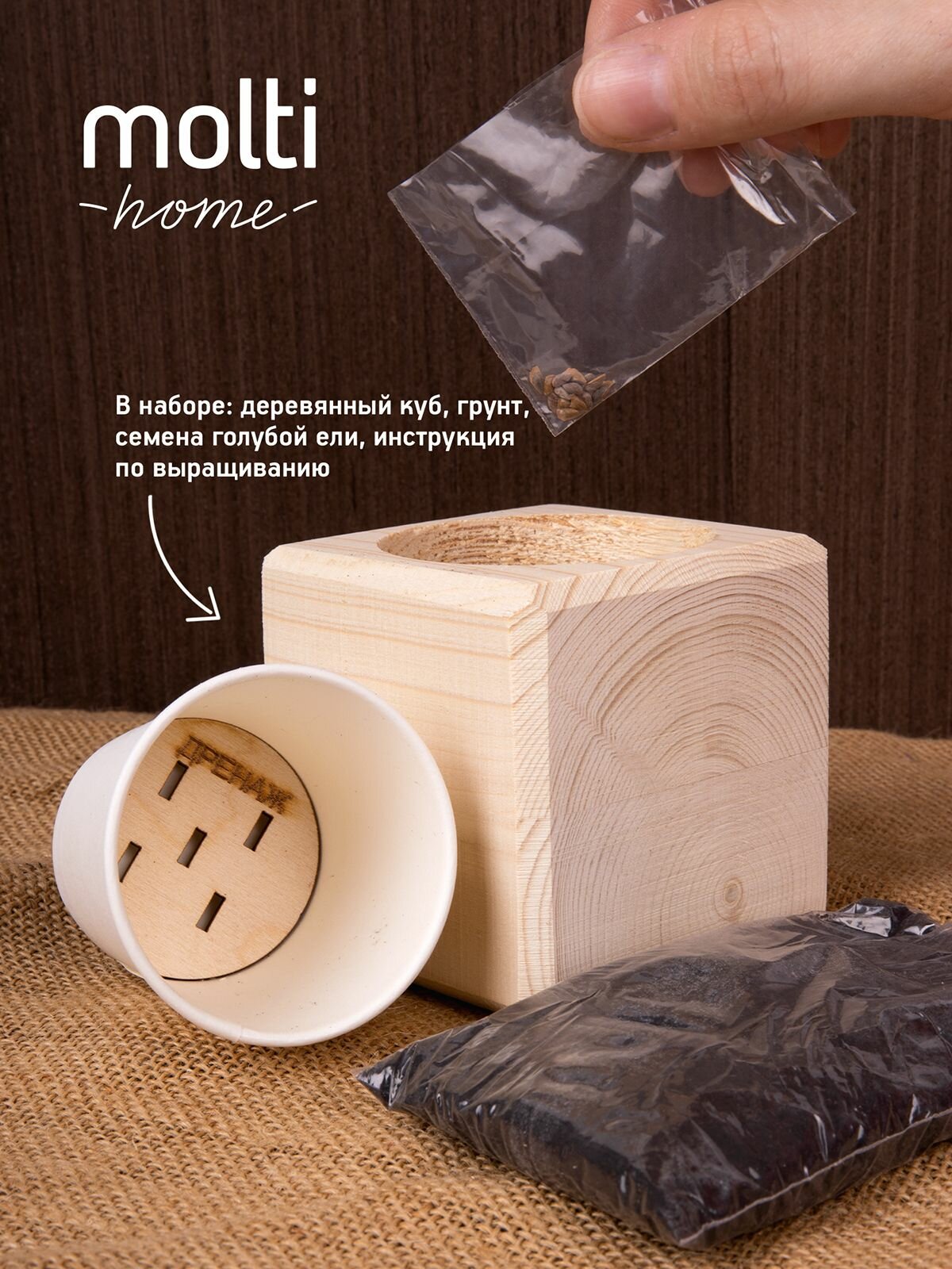 | Комплектация | деревянный куб, грунт, семена голубой ели |